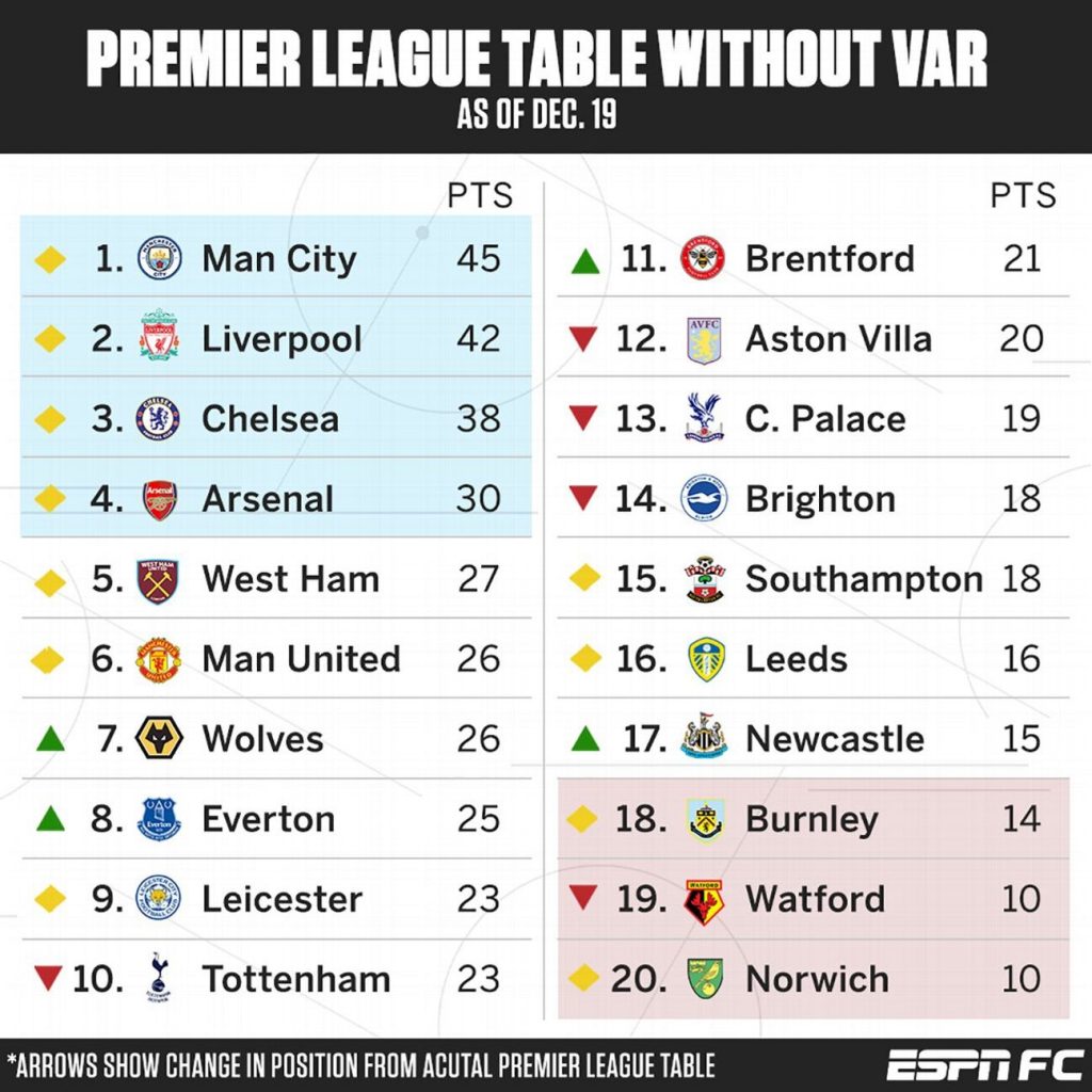 كشف تقرير تخيلي عن جدول ترتيب الدوري الإنجليزي للموسم الحالي، بدون وجود تقنية الفيديو “الڤار”.