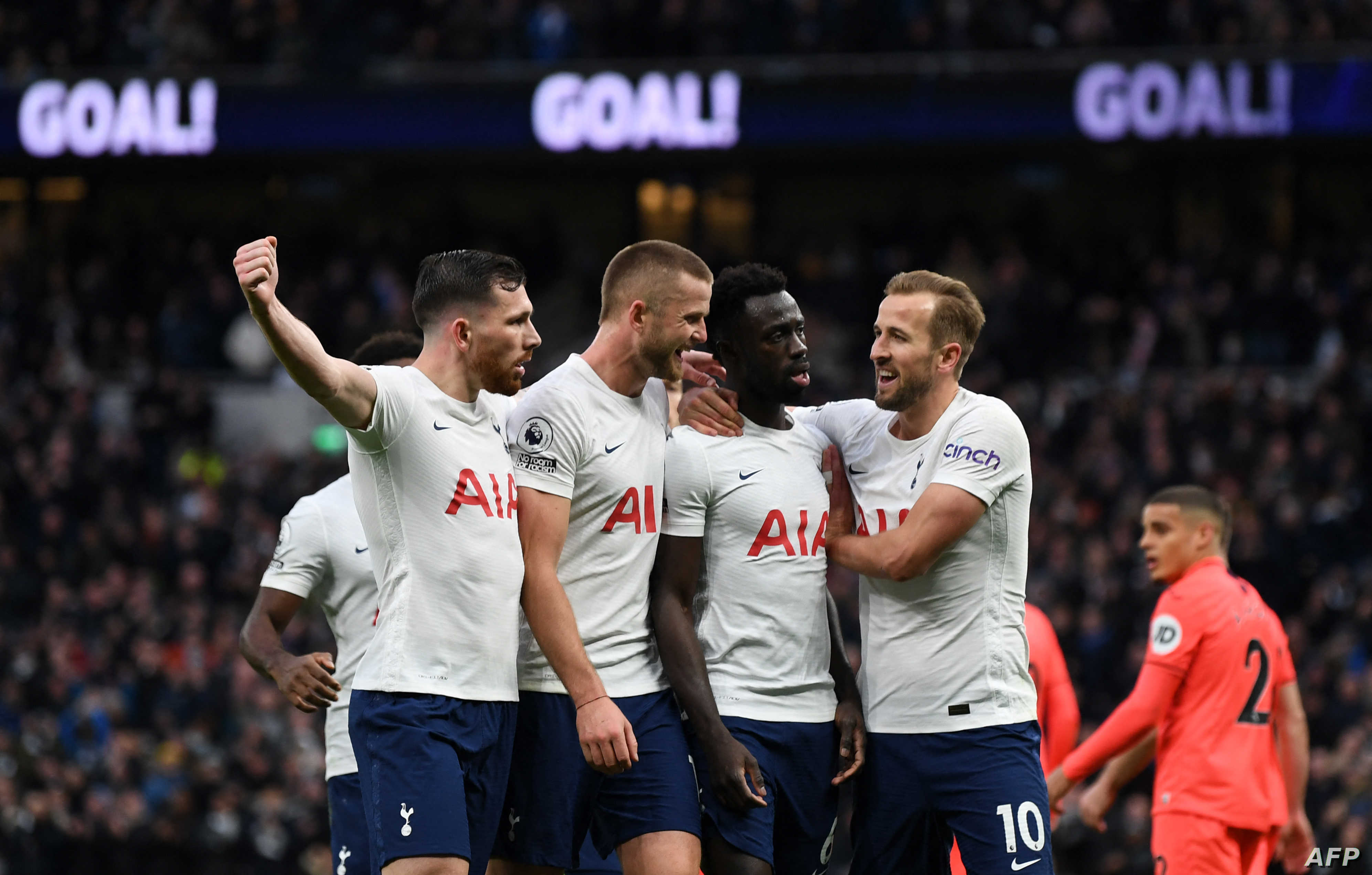 Tottenham Hotspur's Colombian defender Davinson Sanchez (3rd R) celebrates with teammates after scoring their second goal during the English Premier League football match between Tottenham Hotspur and Norwich City at Tottenham Hotspur Stadium in London, on December 5, 2021. (Photo by Daniel LEAL / AFP) / RESTRICTED TO EDITORIAL USE. No use with unauthorized audio, video, data, fixture lists, club/league logos or 'live' services. Online in-match use limited to 120 images. An additional 40 images may be used in extra time. No video emulation. Social media in-match use limited to 120 images. An additional 40 images may be used in extra time. No use in betting publications, games or single club/league/player publications. /