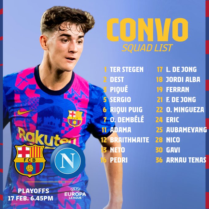 كشف تشافي هرنانديز، مدرب نادي برشلونة الإسباني، عن قائمة البلوجرانا، التي ستخوض مواجهة نابولي الإيطالي، مساء اليوم الخميس، في ذهاب دور الـ32 ببطولة الدوري الأوروبي لموسم 2021-2022.