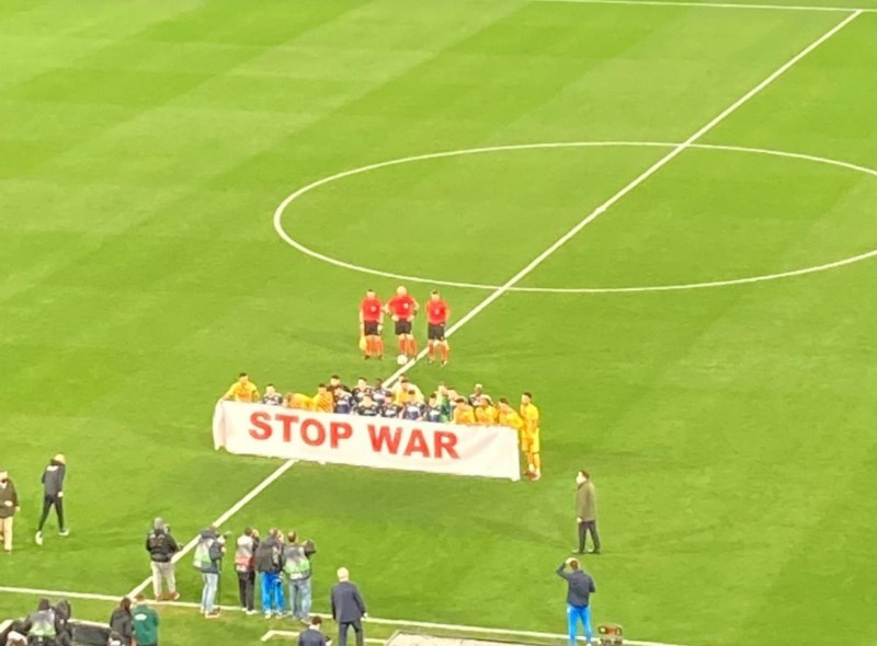 وقبل انطلاق مباراة نابولي وبرشلونة رفع لاعبو الفريقين لافتة للتنديد بالحرب الروسية ضد أوكرانيا وكتبوا عليها: “أوقفوا الحرب”.