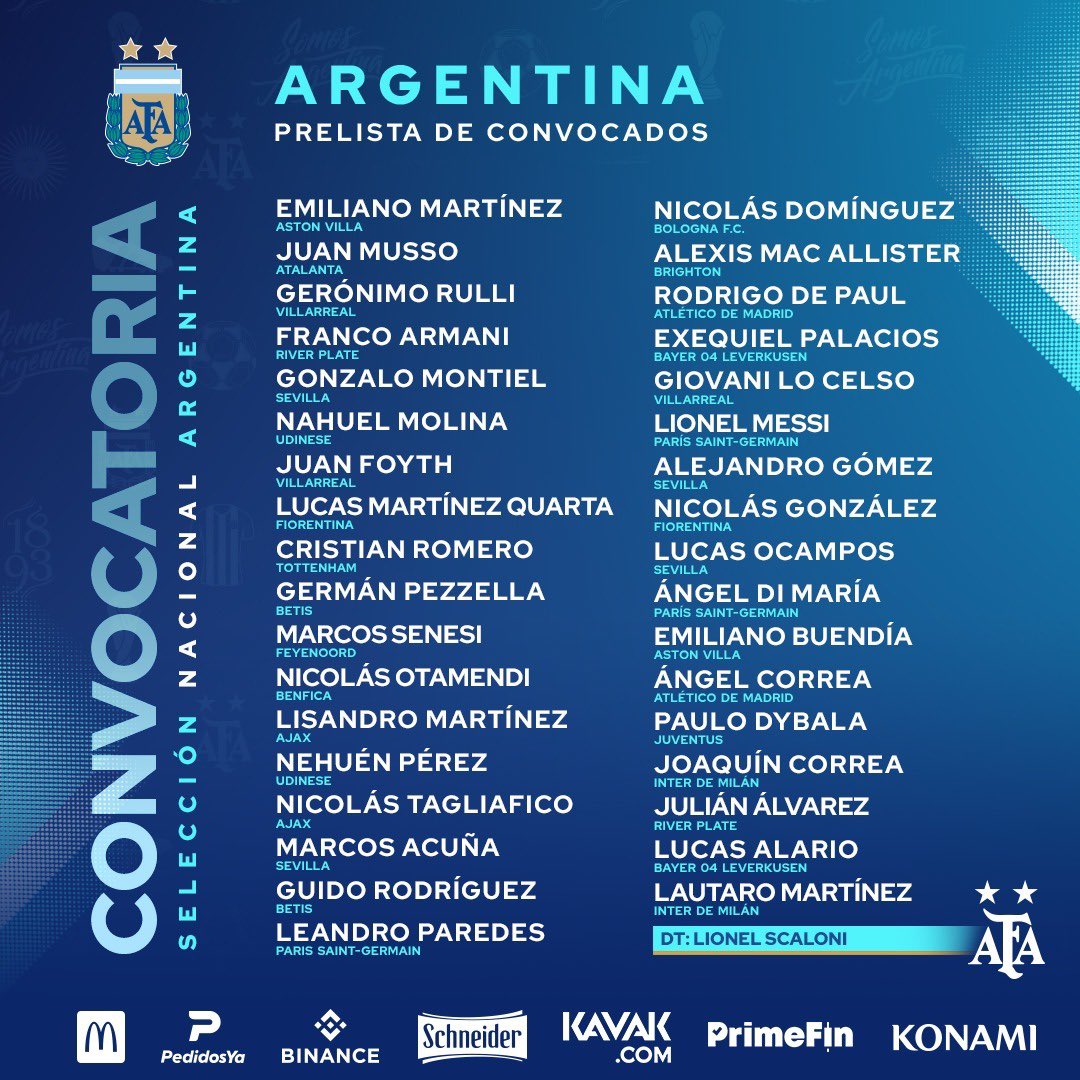خط الوسط: نيكولاس دومينجيز – أليكسيس ماكاليستر – رودريجو دي بول – إيزيكيل بالاسيوس – جيدو رودريجز – لياندرو باريديس –جيوفاني لو سيلسو.