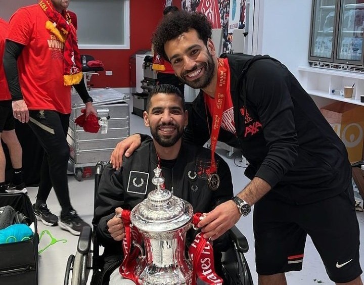 وظهر مؤمن زكريا، في غرفة ملابس لاعبي الفريق الأول لكرة القدم بنادي ليفربول، وهو يحتفل مع صلاح واللاعبين بالكأس.