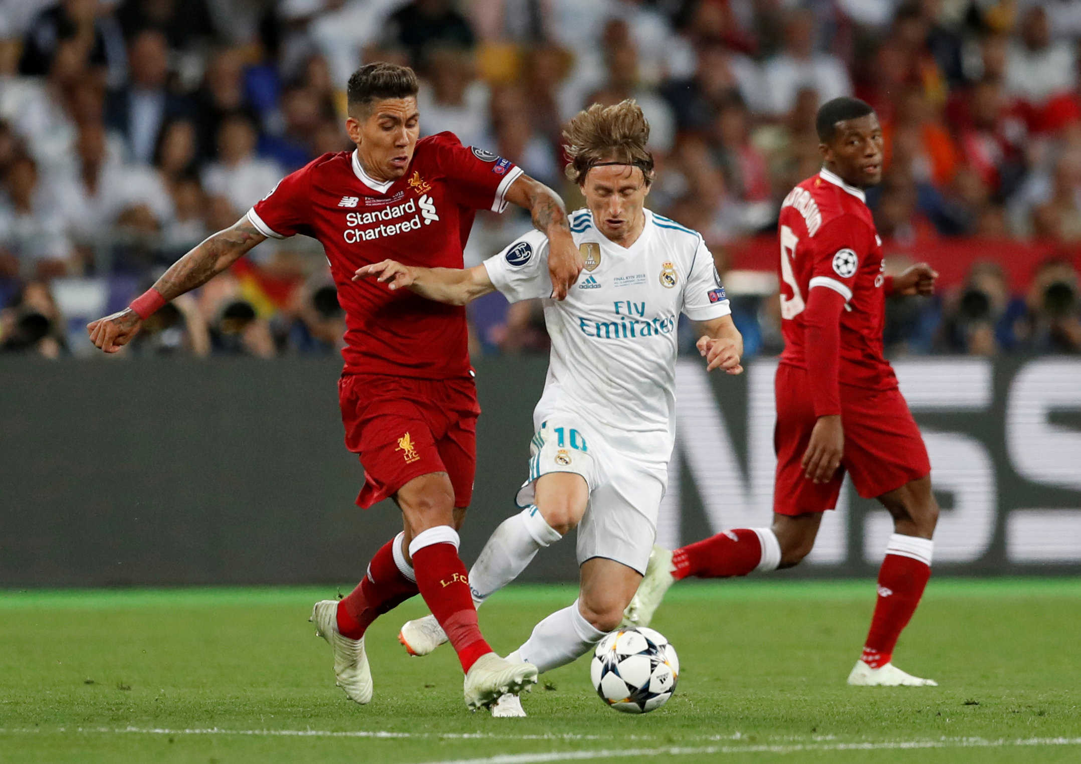 FILE PHOTO: Soccer Football - Champions League Final - Real Madrid v Liverpool - NSC Olympic Stadium, Kiev, Ukraine - May 26, 2018 Liverpool's Roberto Firmino in action with Real Madrid's Luka Modric REUTERS/Andrew Boyers/File Photo