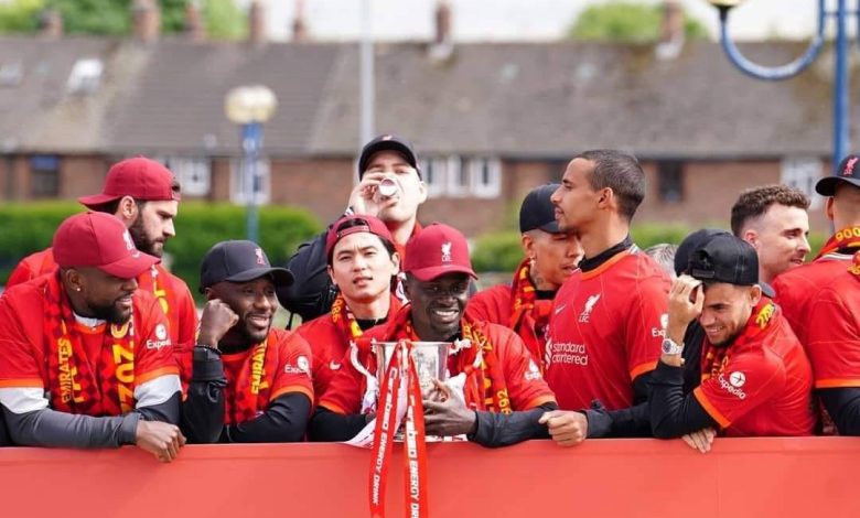 ويحتفل الفريق الأول لكرة القدم بنادي ليفربول، على متن حافلة في شوارع ليفربول، مع جماهيره، بتحقيق لقب بطولتي كأس الاتحاد والرابطة.