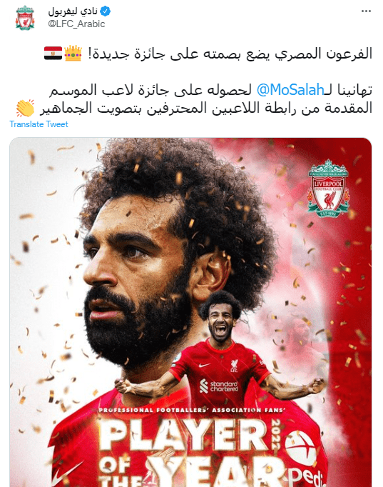 وقام الحساب الرسمي لنادي ليفربول الإنجليزي، على موقع “تويتر”، بنشر صورة للفرعون المصري، خلال احتفالات الفريق التي أقيمت أمس الأحد ، وعلق عليها: “محمد صلاح يضع بصمته على جائزة جديدة، تهانينا للفرعون المصري لحصوله على جائزة لاعب الموسم المقدمة من رابطة اللاعبين المحترفين بتصويت الجماهير”.