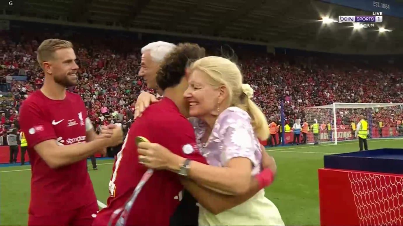 وقامت هيويت، بعناق محمد صلاح أثناء تسليمه ميدالية بطولة الدرع الخيرية، الذي حققها ليفربول على حساب مانشستر سيتي.