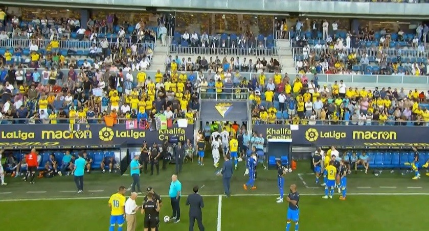 وفي الدقيقة 85 توقفت المباراة بسبب حالة صحية طارئة في أحد المدرجات، واستمرت حتى الآن، حيث قام حارس قادش بالجري مسرعًا نحو المدرجات للمساعدة بنقل المعدات الطبية.
