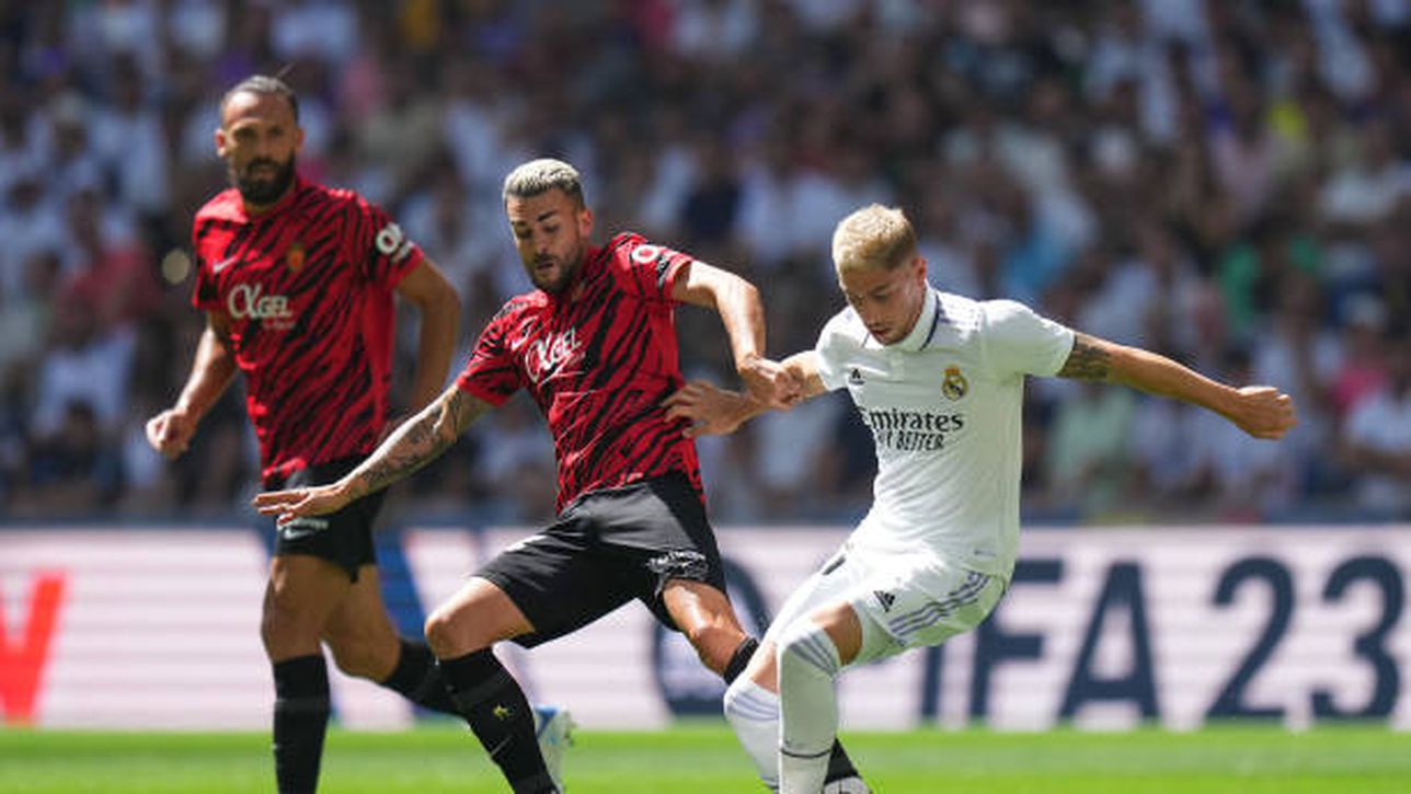 MADRID, SPAIN - SEPTEMBER 11: Federico Valverde of Real Madrid CF is challenged by Dani Rodriguez of RCD Mallorca during the LaLiga Santander match between Real Madrid CF and RCD Mallorca at Estadio Santiago Bernabeu on September 11, 2022 in Madrid, Spain. (Photo by Angel Martinez/Getty Images)
