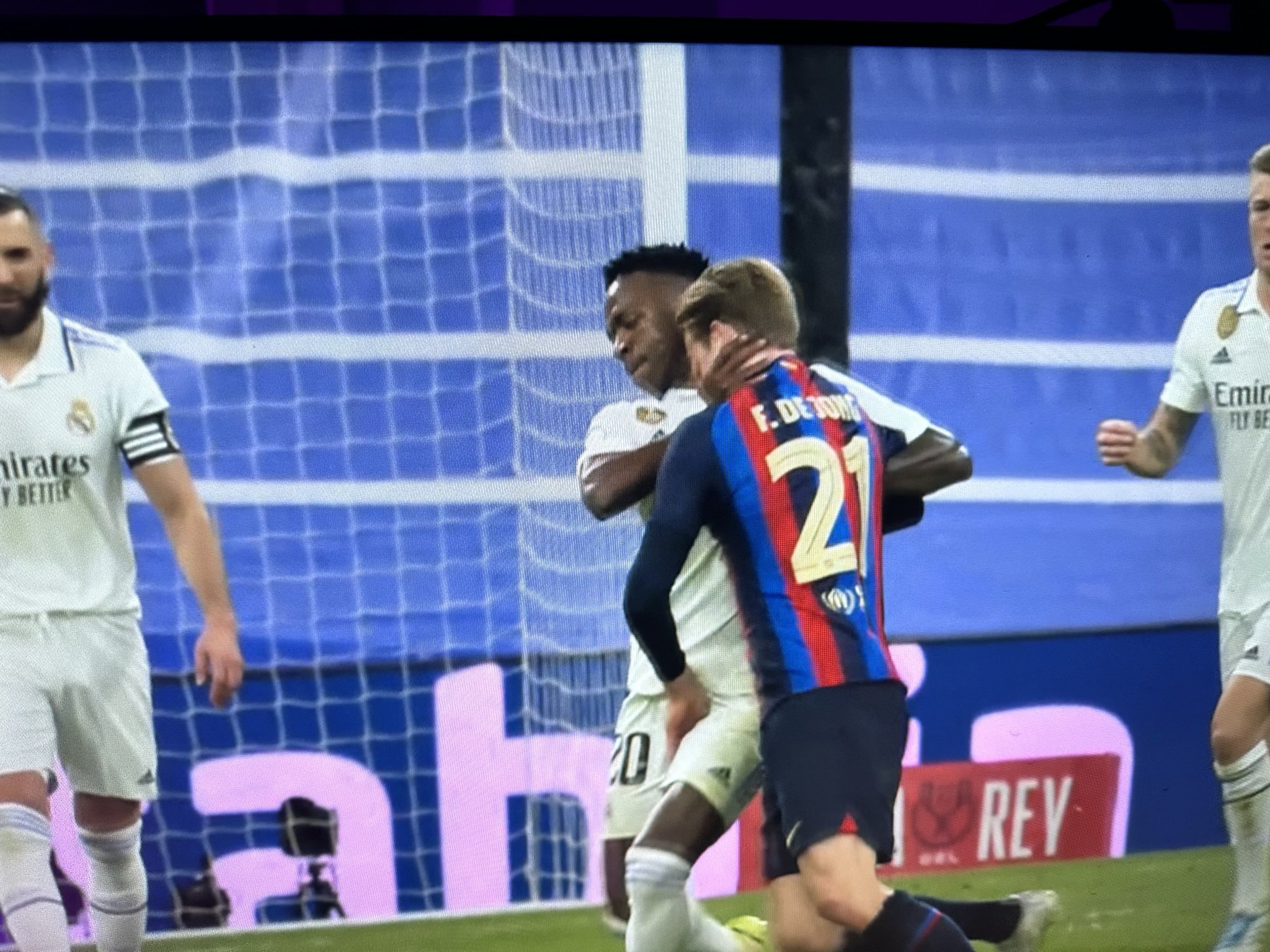 شهدت مباراة ريال مدريد وبرشلونة المقامة الآن على ملعب سانتياجو بيرنابيو، ضمن منافسات نصف نهائي كأس ملك إسبانيا تدخل عنيف من فينسيوس على، فرينكي دي يونج.