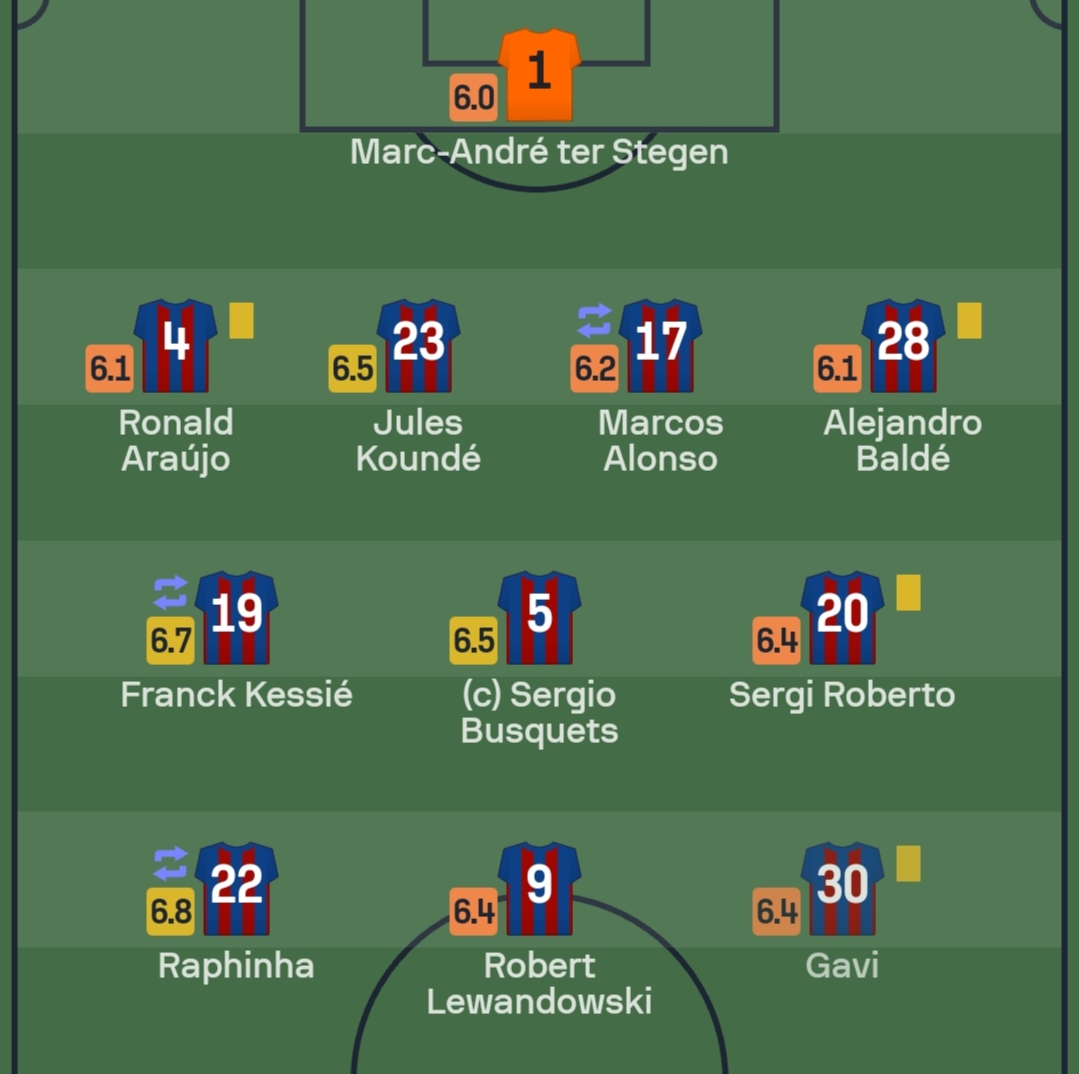 بينما حصل مارك أندريه تير شتيجن حارس مرمى برشلونة، على أسوأ تقييم في المباراة بـ6.0 درجة، وكان رافينيا هو الأفضل من فريق البارسا بـ6.8.
