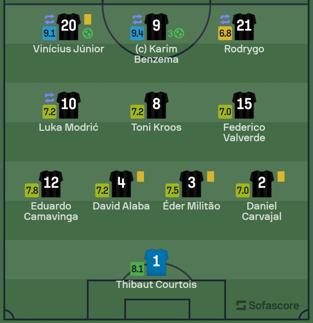 وبحسب شبكة سوفا سكور، فإن كريم بنزيما الذي أحرز هاتريك، كان أفضل لاعب في المباراة بتقييم 9.4 درجة، سلسله فينيسيوس جونيور بـ 9.1.