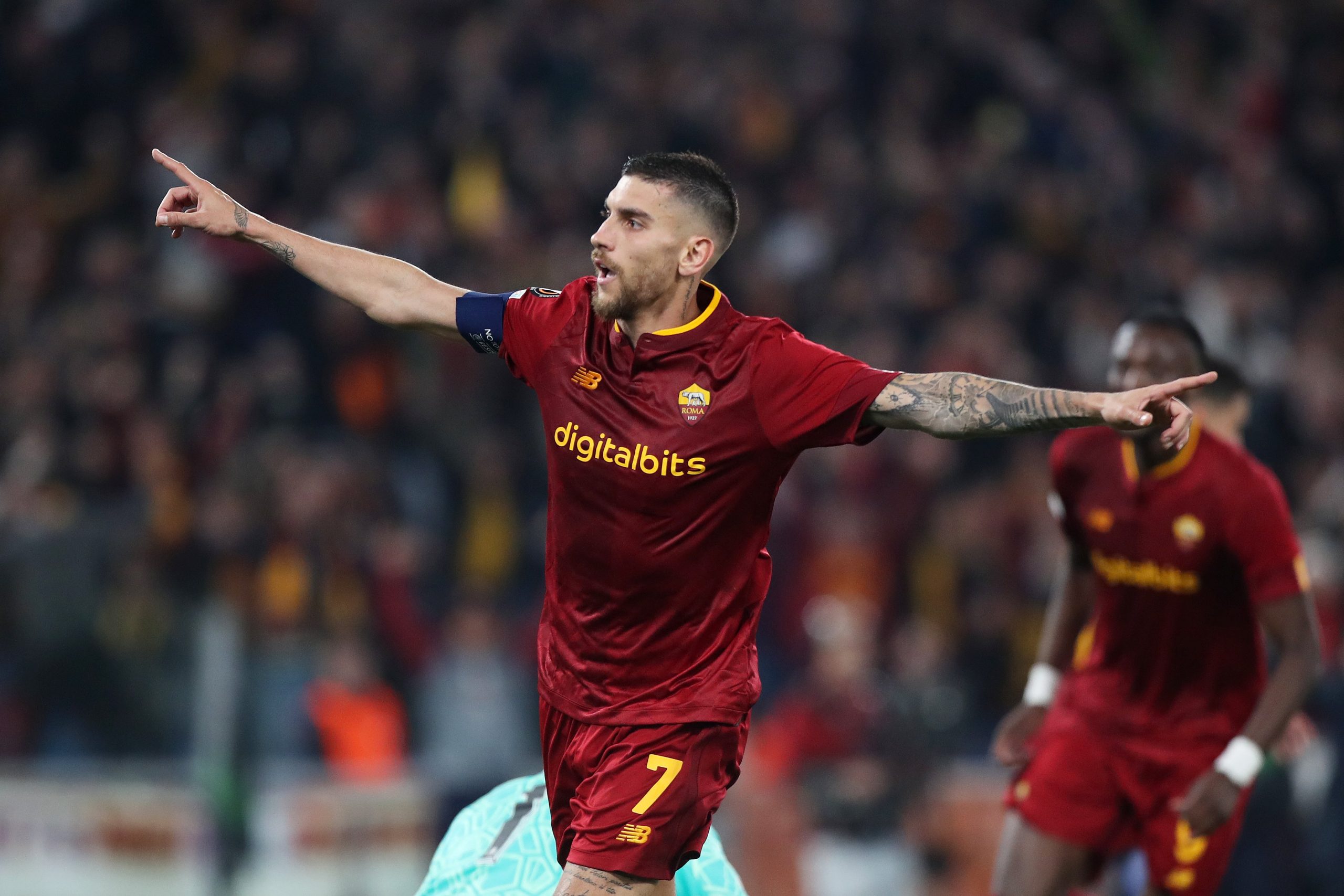 احتفال لورينزو بيليجريني بتسجيل هدف روما الرابع أمام فينورد