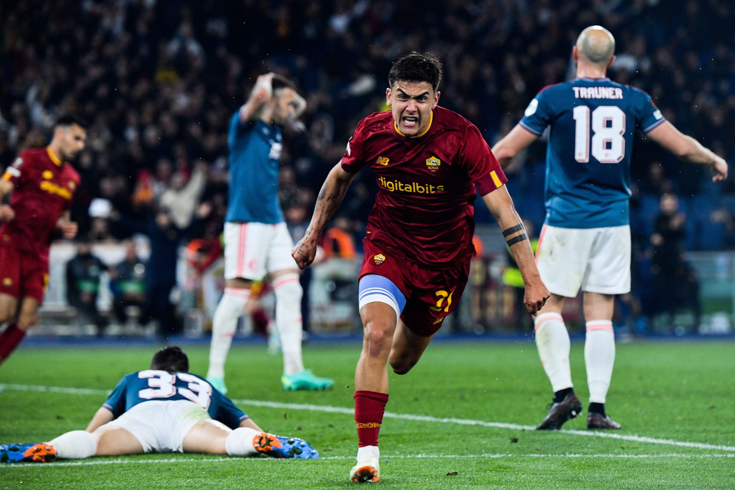 احتفال باولو ديبالا بتسجيل هدف روما الثاني أمام فينورد
