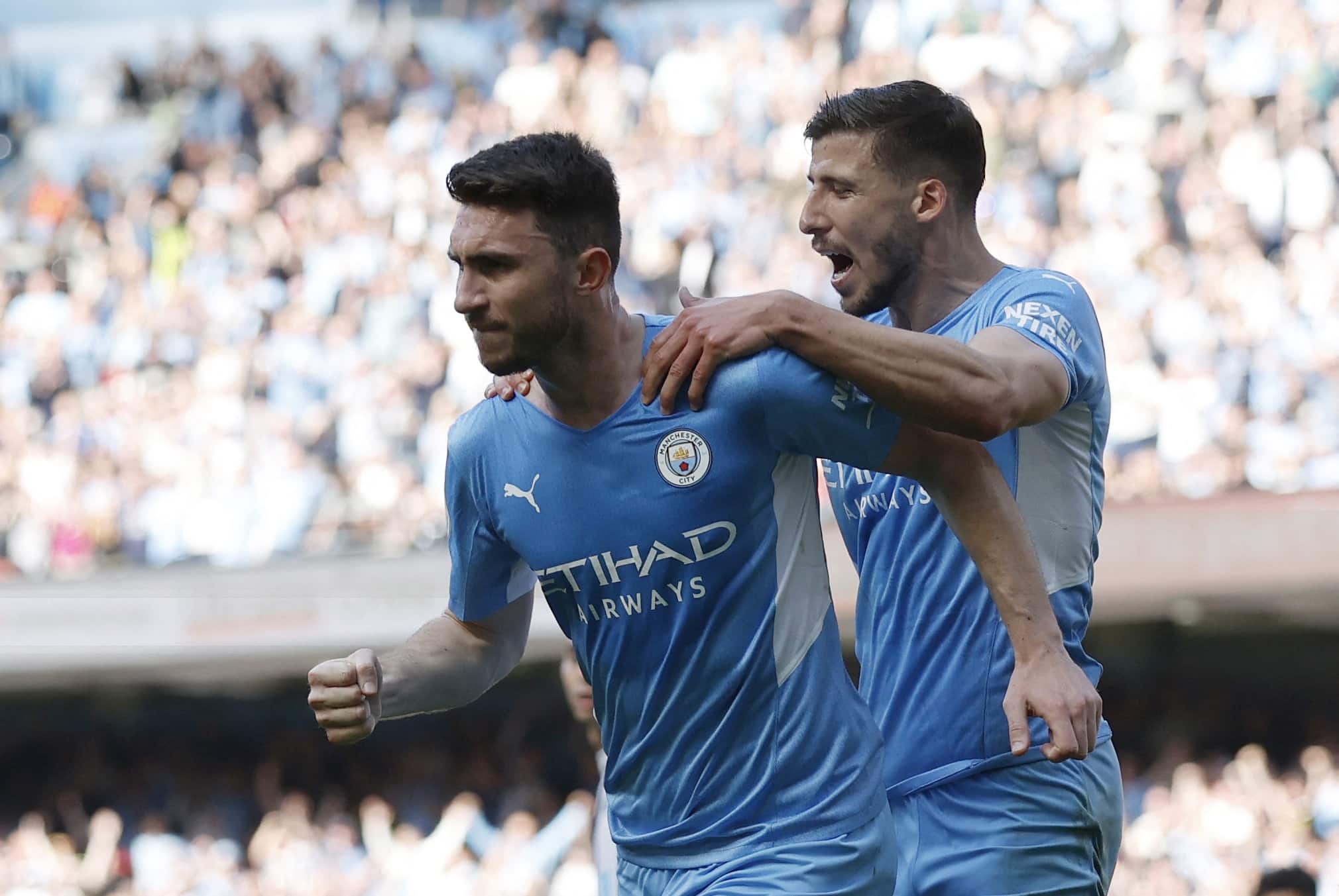Soccer Football - Premier League - Manchester City v Newcastle United - Etihad Stadium, Manchester, Britain - May 8, 2022 Manchester City's Aymeric Laporte celebrates scoring their second goal with Ruben Dias Action Images via Reuters/Jason Cairnduff EDITORIAL USE ONLY. No use with unauthorized audio, video, data, fixture lists, club/league logos or 'live' services. Online in-match use limited to 75 images, no video emulation. No use in betting, games or single club /league/player publications. Please contact your account representative for further details.
