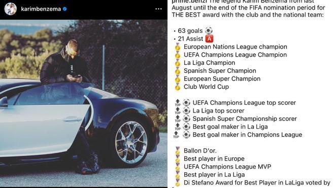 وبرز في المنشور تسليط الضوء على تسجيل بنزيمة 63 هدفًا وصناعة 23 آخرين مع ريال مدريد ومنتخب فرنسا، إضافة إلى الألقاب الكثيرة الرائعة التي حققها خلال فترة التقييم.