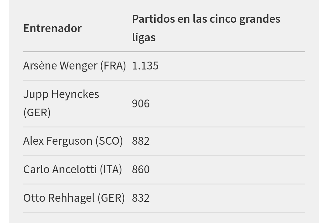 ومن جهة أخرى، يتواجد كارلو أنشيلوتي في المركز الرابع في قائمة أكثر المدربين خوضًا للمباريات في الدوريات الخمس الكبرى بعدد 860 مباراة.