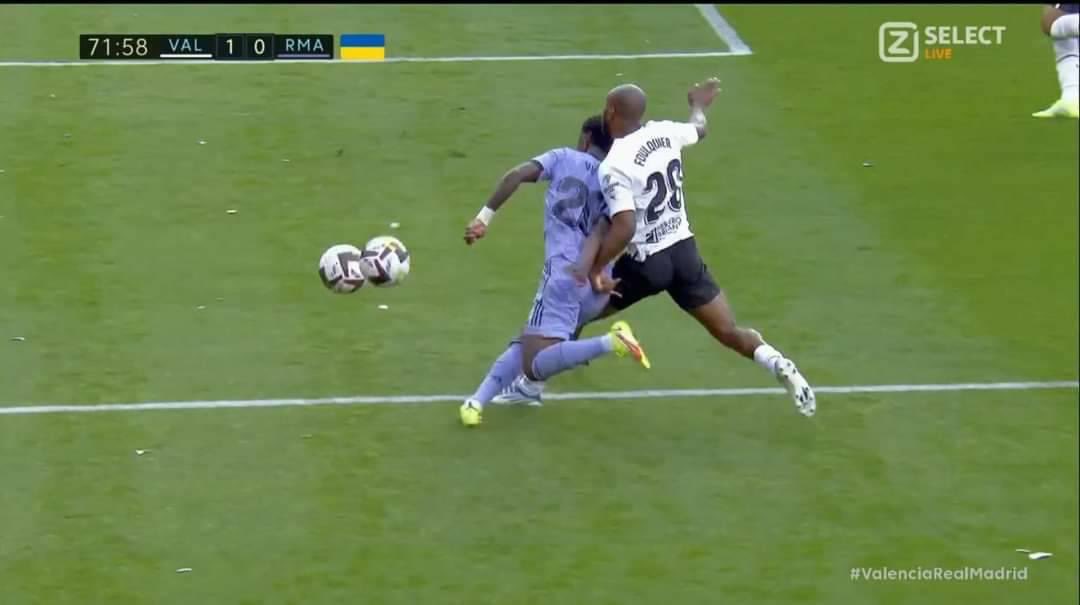 وامتلك فينيسيوس إحدى الكرات واتجه نحو منطقة الجزاء في محاولة هجومية لصالح ريال مدريد، وعلى الجانب الآخر كانت الكرة الثانية مع مدافع فالنسيا الذي شتتها لترتطم في الكرة الأخرى.