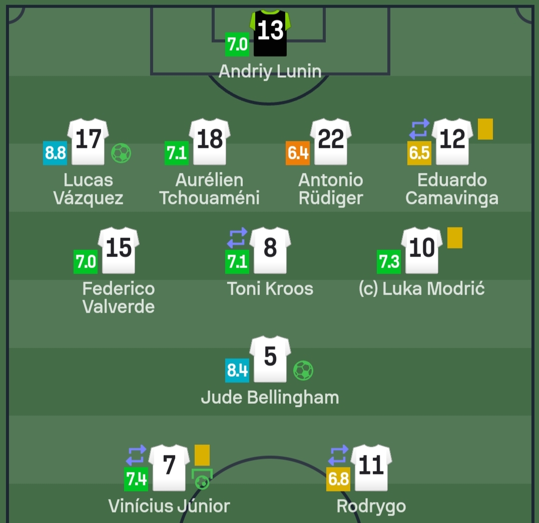 وبحسب سوفا سكور، فإن لوكاس فاسكيز، كان أفضل لاعبي النادي الملكي خلال اللقاء بتقييم 8.8، يليه جود بيلينجهام بـ8.4 درجة.