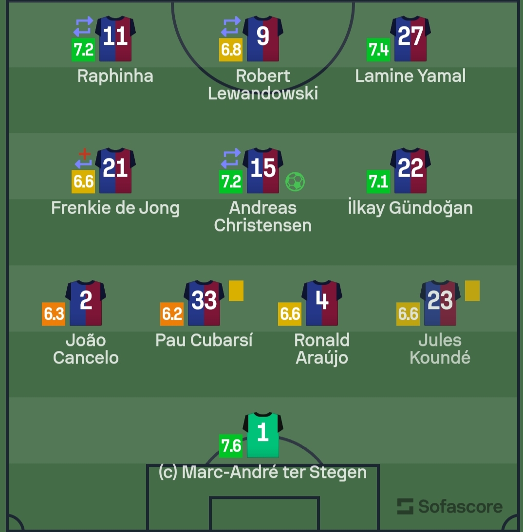 وكان تير شتيجن حارس البارسا، أفضل لاعبي الفريق في كلاسيكو الدوري الإسباني بتقييم 7.6، يليه لامين يامال بـ7.4.