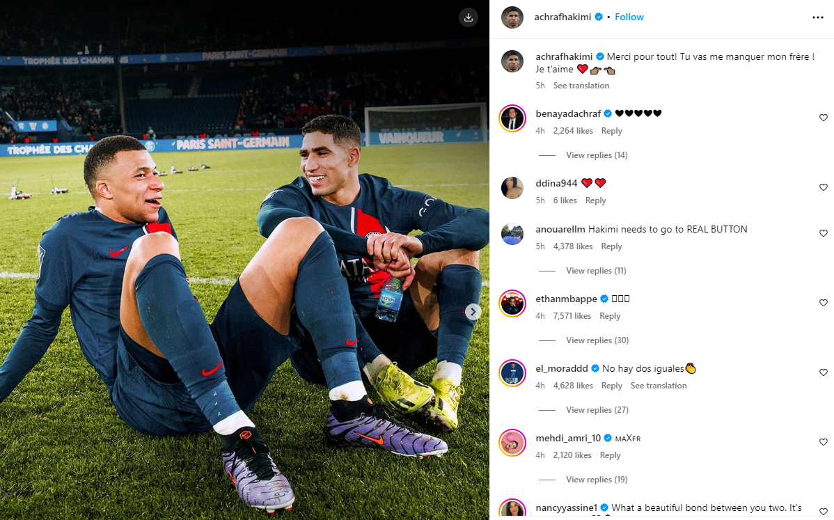 وجه المغربي أشرف حكيمي، لاعب فريق باريس سان جيرمان، اليوم الإثنين، رسالة إلى زميله السابق كيليان مبابي، والذي انضم إلى صفوف ريال مدريد الإسباني، أمس الإثنين.