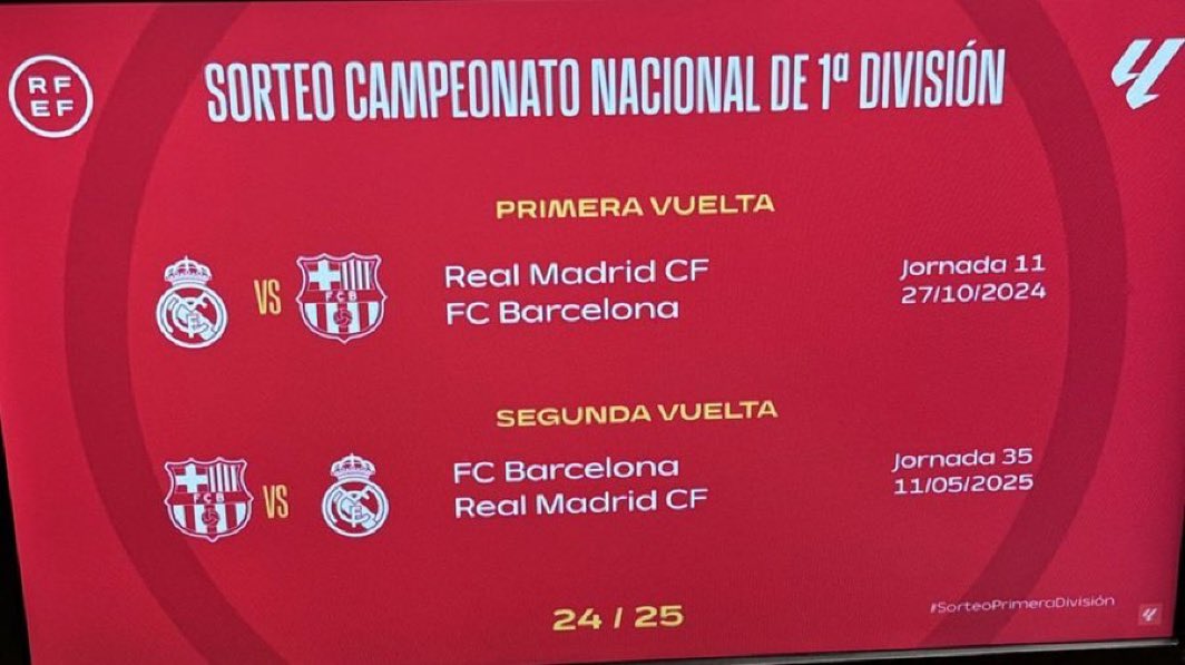 ويقام كلاسيكو الدور الأول بين ريال مدريد وبرشلونة في الجولة 11، وذلك على ملعب سانتياجو برنابيو يوم 27 أكتوبر، بينما يقام كلاسيكو الإياب على ملعب برشلونة في الجولة 35 يوم 11 مايو.