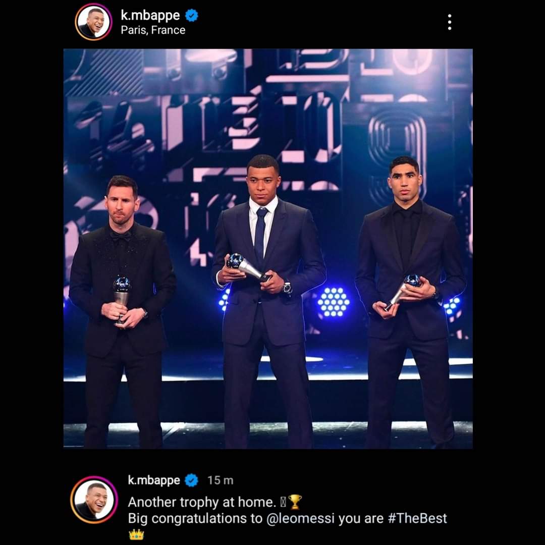 وكتب مبابي عبر صفحته الشخصية على موقع التواصل الإجتماعي إنستجرام : “كأس جديد في المنزل، مبروك ميسي أنت الأفضل.”