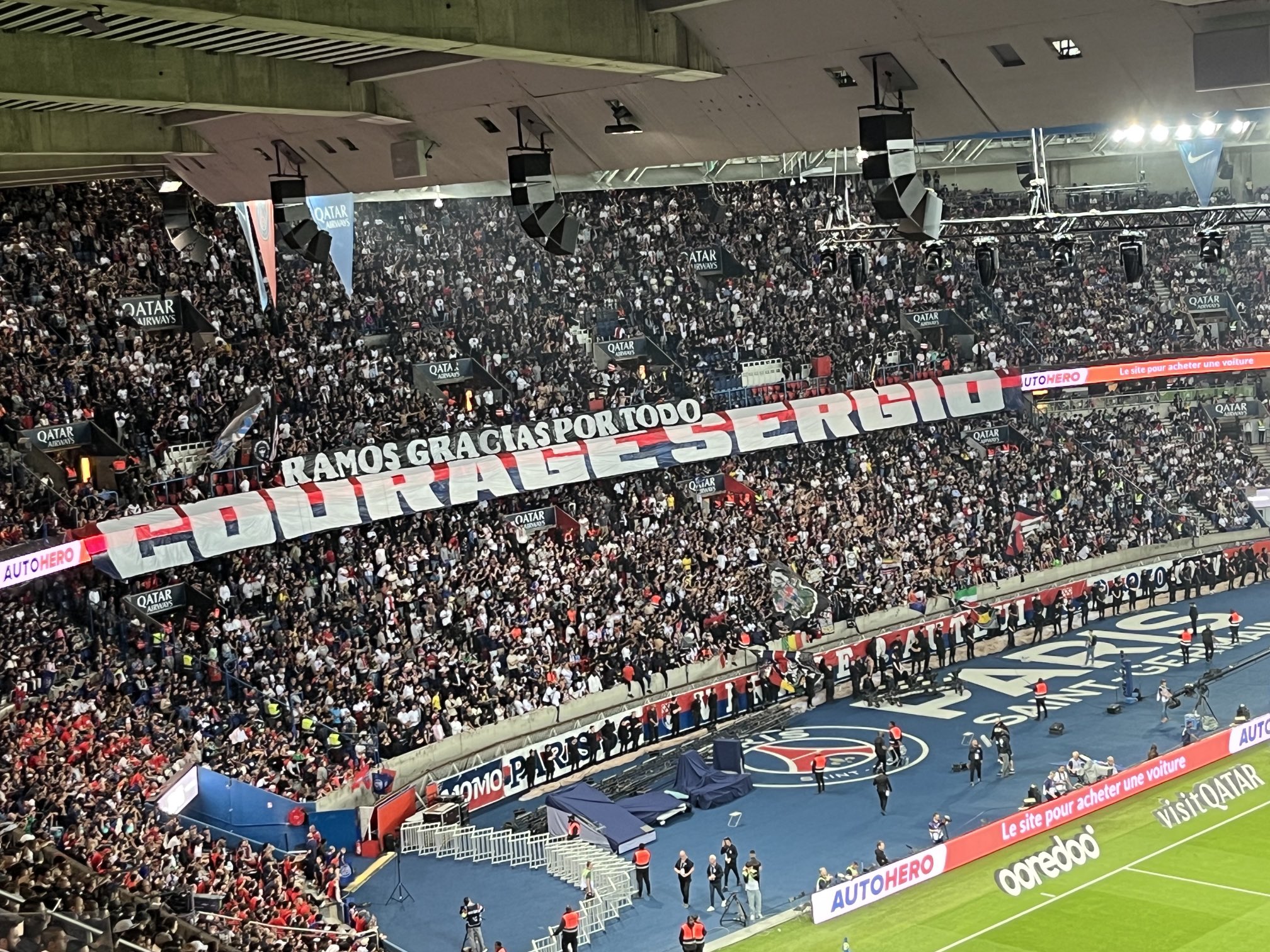 وعلى الجانب الأخر، رددت جماهير نادي العاصمة الفرنسية هتافات تشجيعية لسيرجيو راموس، الذي أعلن رحيله هو الآخر عن الفريق بنهاية مباراة اليوم، ليكتفي بقضاء موسمين في حديقة الأمراء.