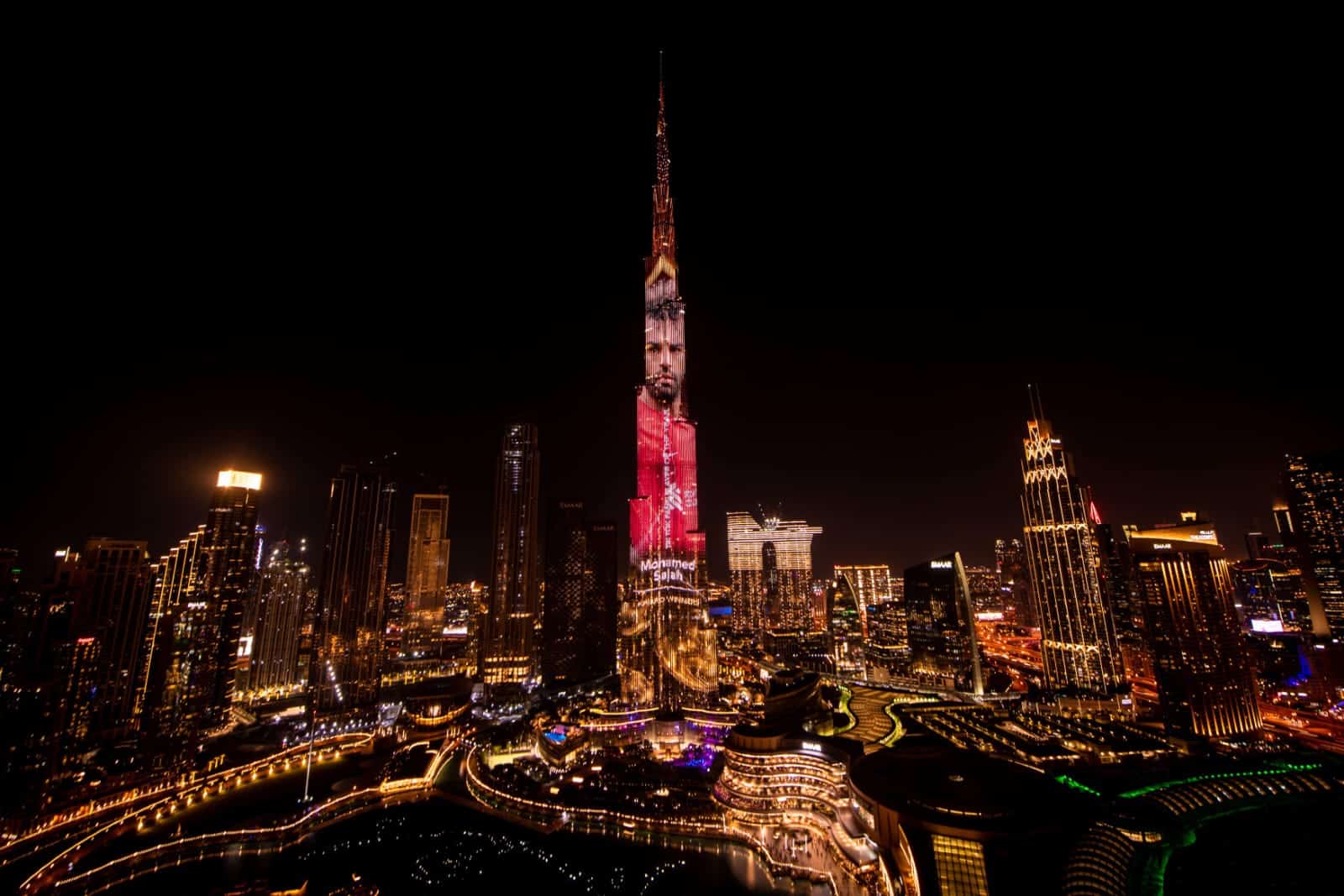 زينت صورة الدولي المصري محمد صلاح، نجم الفريق الأول لكرة القدم بنادي ليفربول الإنجليزي، برج خليفة في دبي الإماراتية، بعد فوزه بجائزة أفضل لاعب في العالم لعام 2022 من جلوب سوكر.