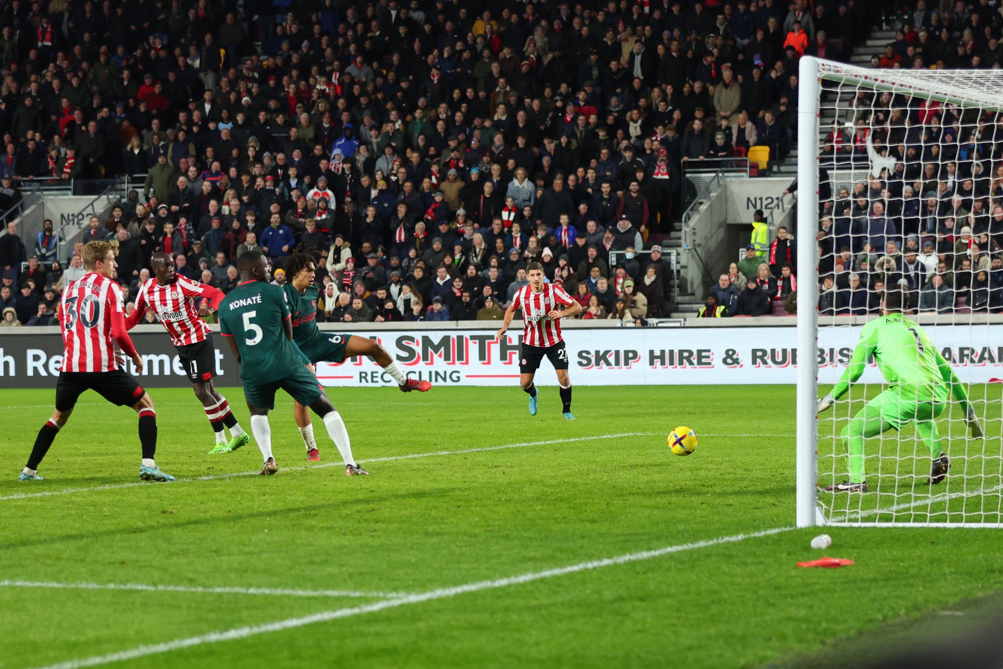 وافتتح برينتفورد نتيجة المباراة في الدقيقة 19 بهدف من نيران صديقة، وقعه مدافع ليفربول، الفرنسي إبراهيما كوناتي، في مرماه بالخطأ حينما كان يحاول إبعاد الركلة الركنية التي نفذها الكاميروني بريان مبيومو.