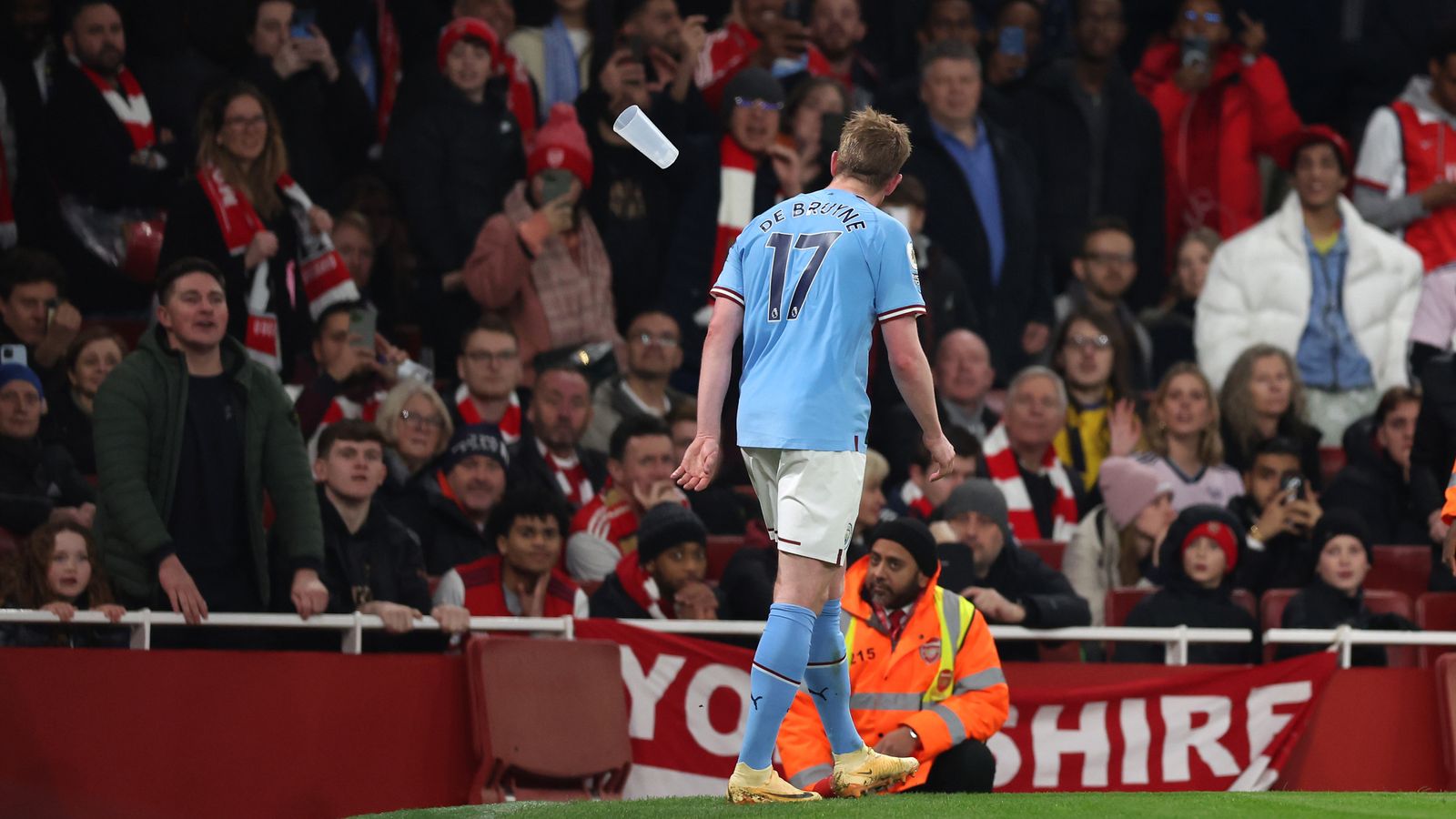 ويعود تحقيق الاتحاد الإنجليزي إلى قيام بعض جماهير أرسنال بإلقاء زجاجات بلاستيكية وأشياء آخرى على دي بروين خلال توجهه إلى دكة بدلاء مانشستر سيتي بعد استبداله في الدقيقة 87.