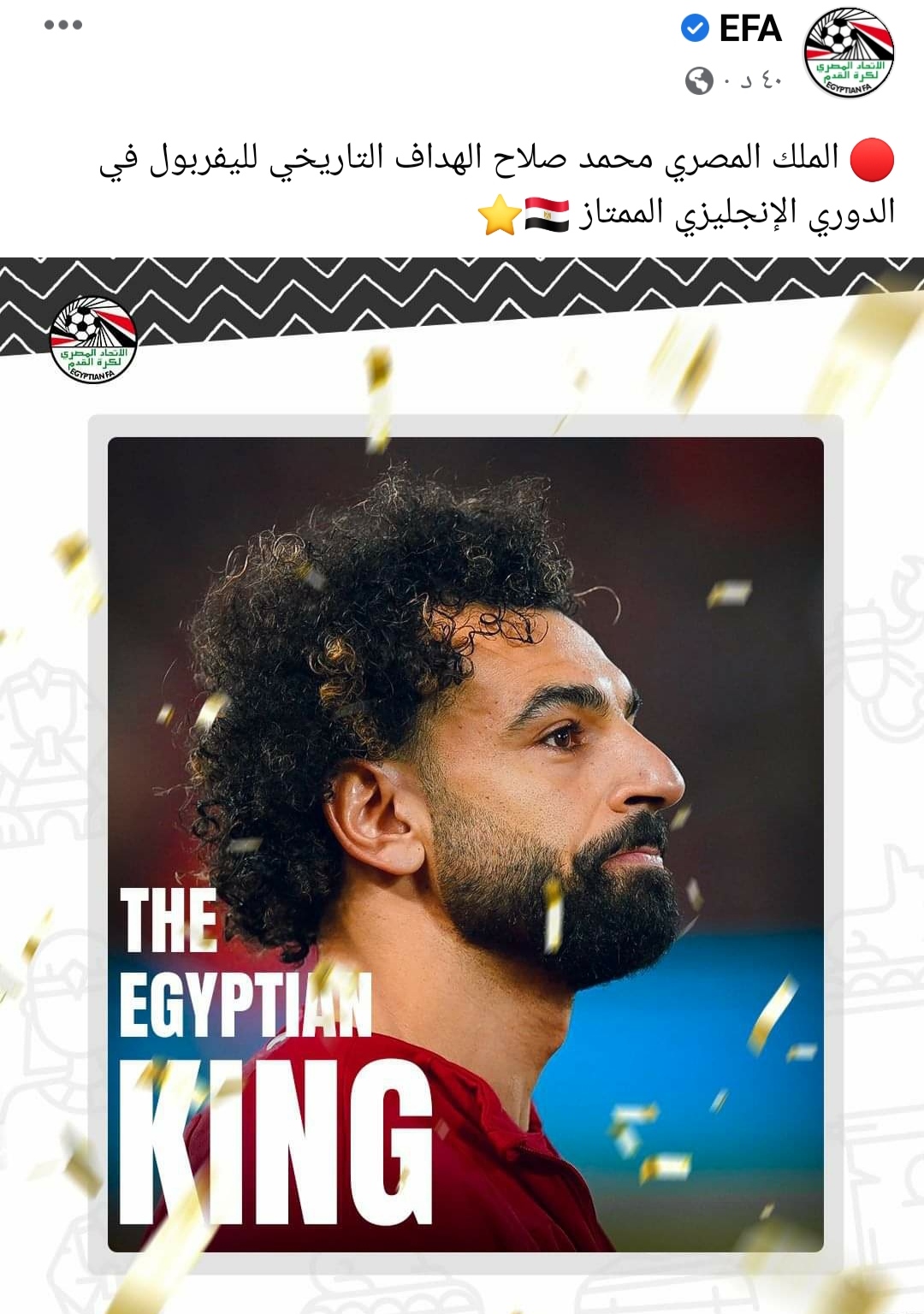 ونشر الحساب الرسمي لاتحاد الكرة عبر موقع التواصل الاجتماعي “فيس بوك” صورة للفرعون المصري وعلق بـ: “الملك المصري محمد صلاح الهداف التاريخي لليفربول في الدوري الإنجليزي الممتاز”.