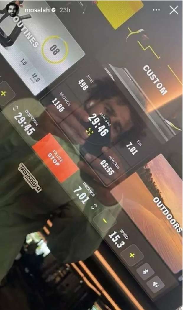 ونشر محمد صلاح، صورة وهو يركض على المشاية الرياضية، بعدما قطع أكثر من 7 كيلومترات، خلال 29 دقيقة و24 ثانية، وهو رقم مدهش.