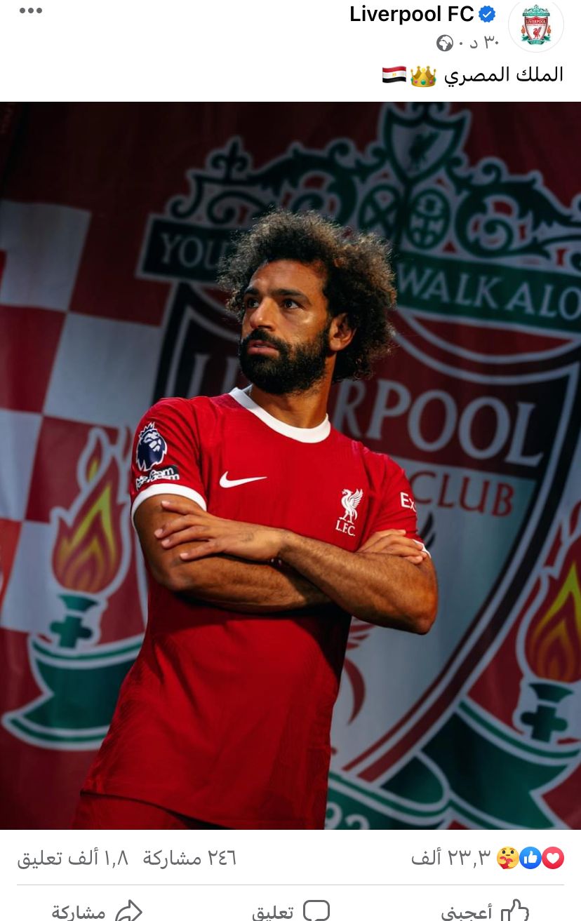 ونشر نادي ليفربول الإنجليزي صورة للاعب فريقه محمد صلاح، بعد أنباء موافقه على الانضمام إلى الاتحاد السعودي وعلق: “الملك المصري”.