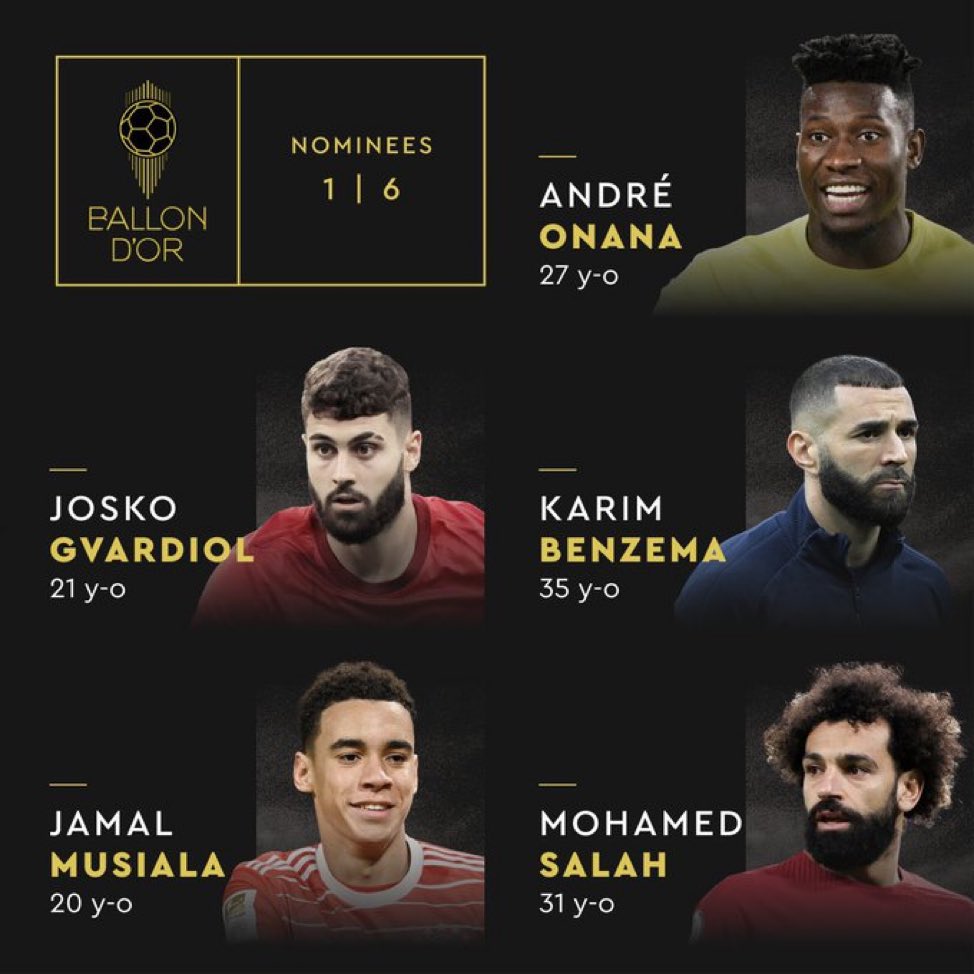 وبحسب المجلة الفرنسية، فإن أول خمس مرشحين لجائزة الكرة الذهبية، هم: محمد صلاح (ليفربول)، الكرواتي جوسكو جفارديول (مانشستر سيتي)،  والكاميروني أندريه أونانا حارس مانشستر يونايتد،  الفرنسي كريم بنزيما (اتحاد جدة السعودي).