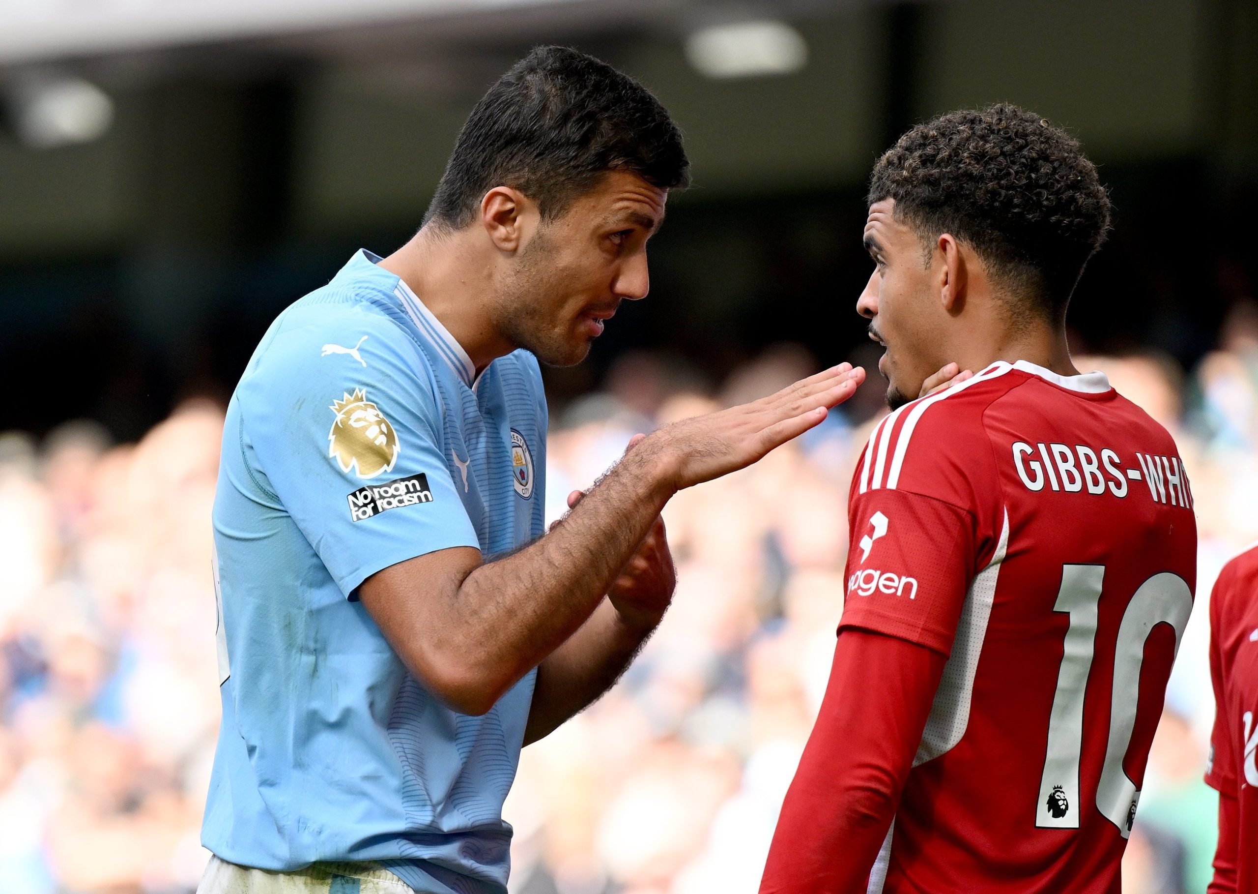 ودخل رودري في شجار قوي مع جيبس وايت في إحدى الكرات المشتركة مع بداية الشوط الثاني، ليقوم نجم السيتي بالاعتداء على لاعب نوتنجهام فورست بدون كرة.
