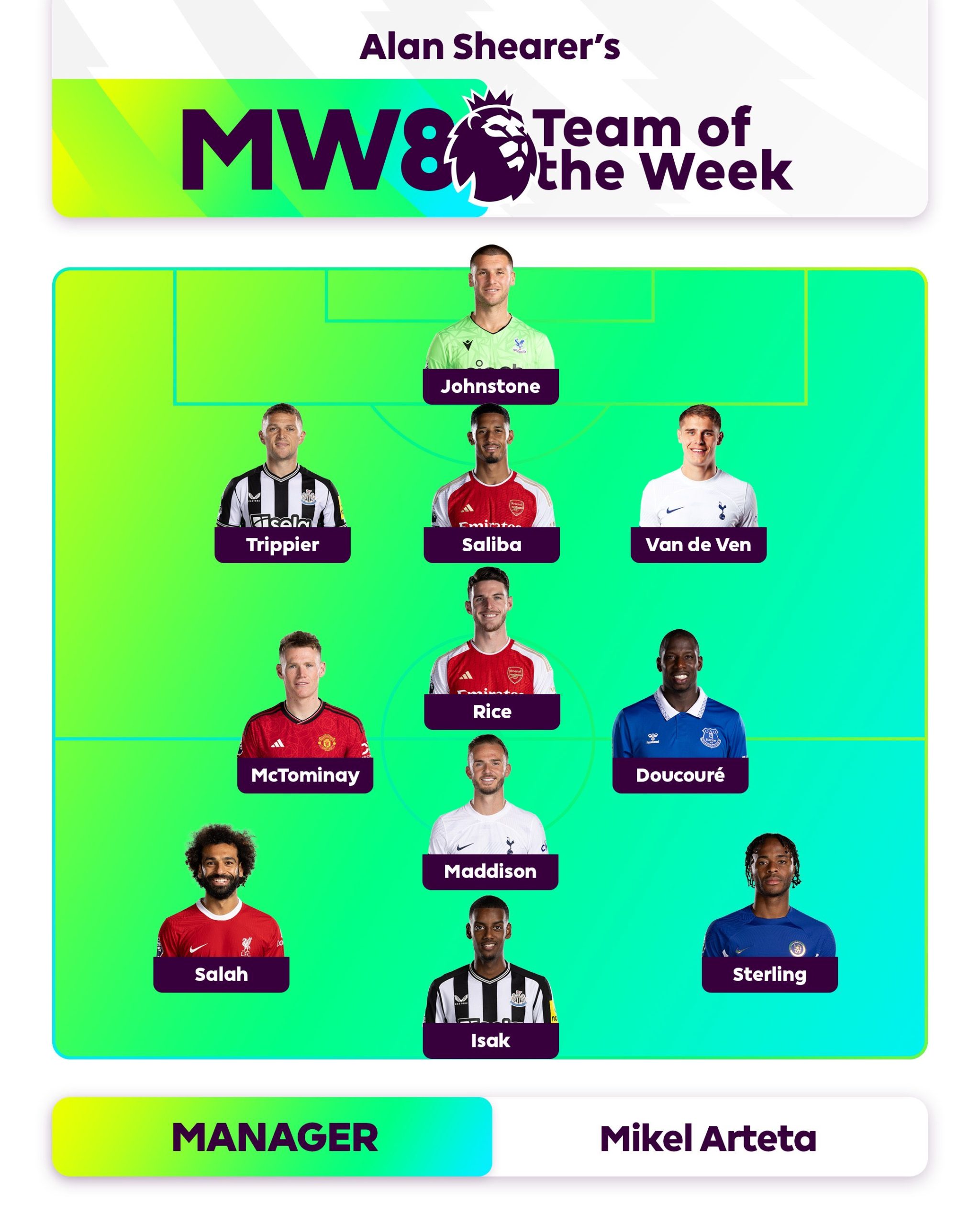 كما اختير محمد صلاح ضمن التشكيل المثالي الذي وضعه الأسطورة آلان شيرار، للجولة الثامنة من البريميرليج.