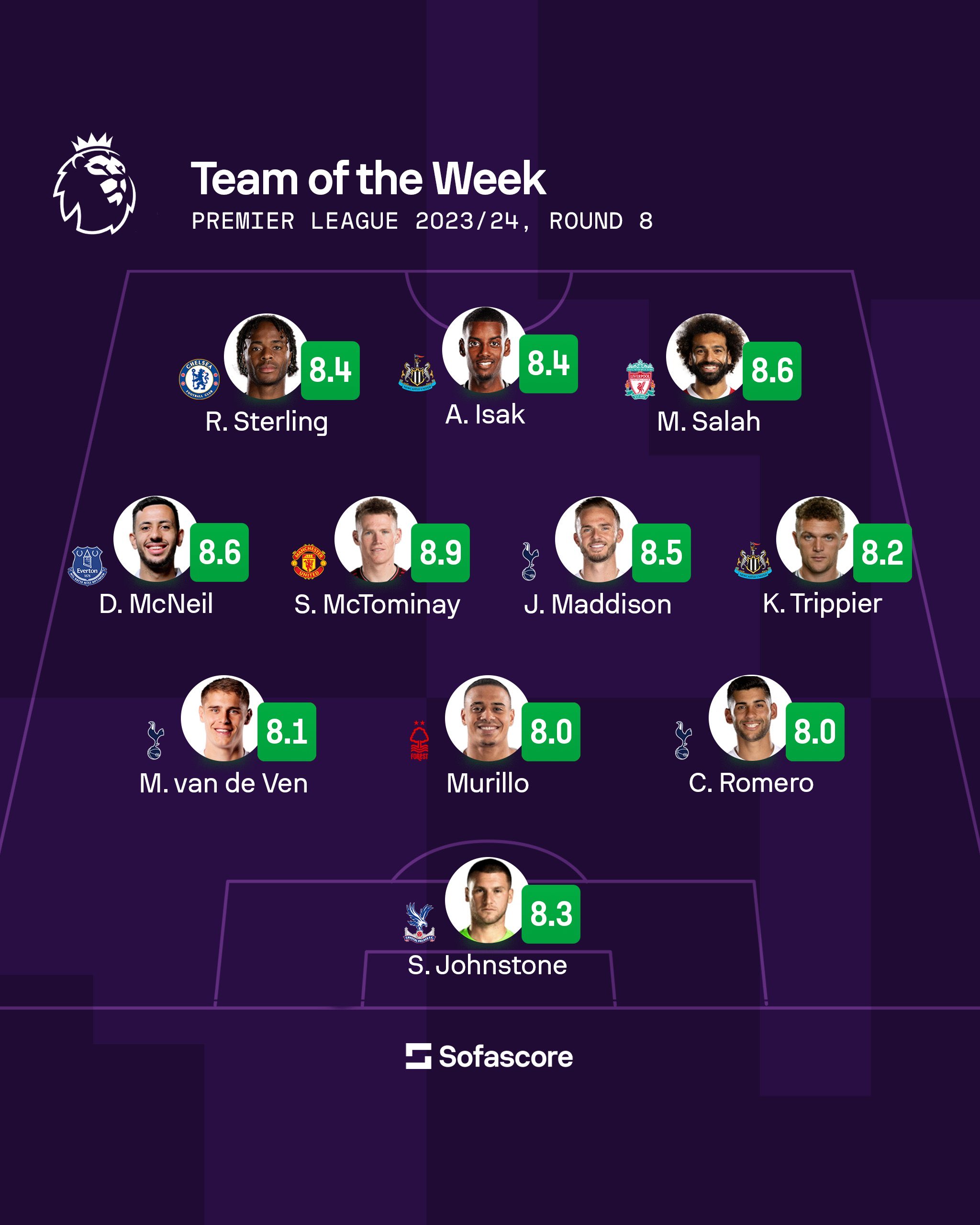 ووفقًا لموقع سوفا سكور، فإن محمد صلاح يأتي على رأس التشكيل الأفضل في الجولة 8 من الدوري الإنجليزي الممتاز.
