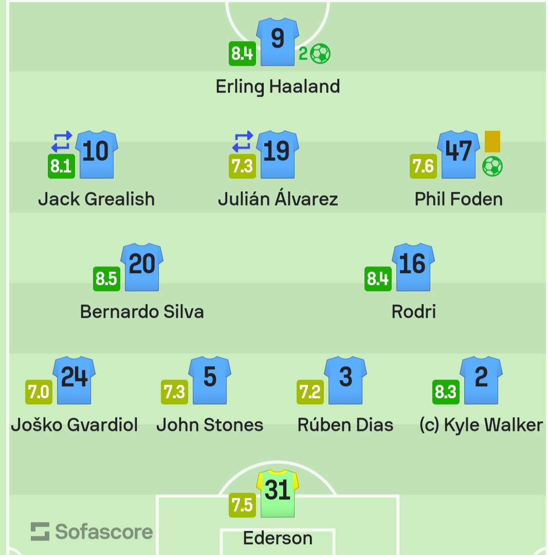 لعب هالاند في مباراة الديربي بين السيتي واليونايتد 90 دقيقة، وسجل هدفين.