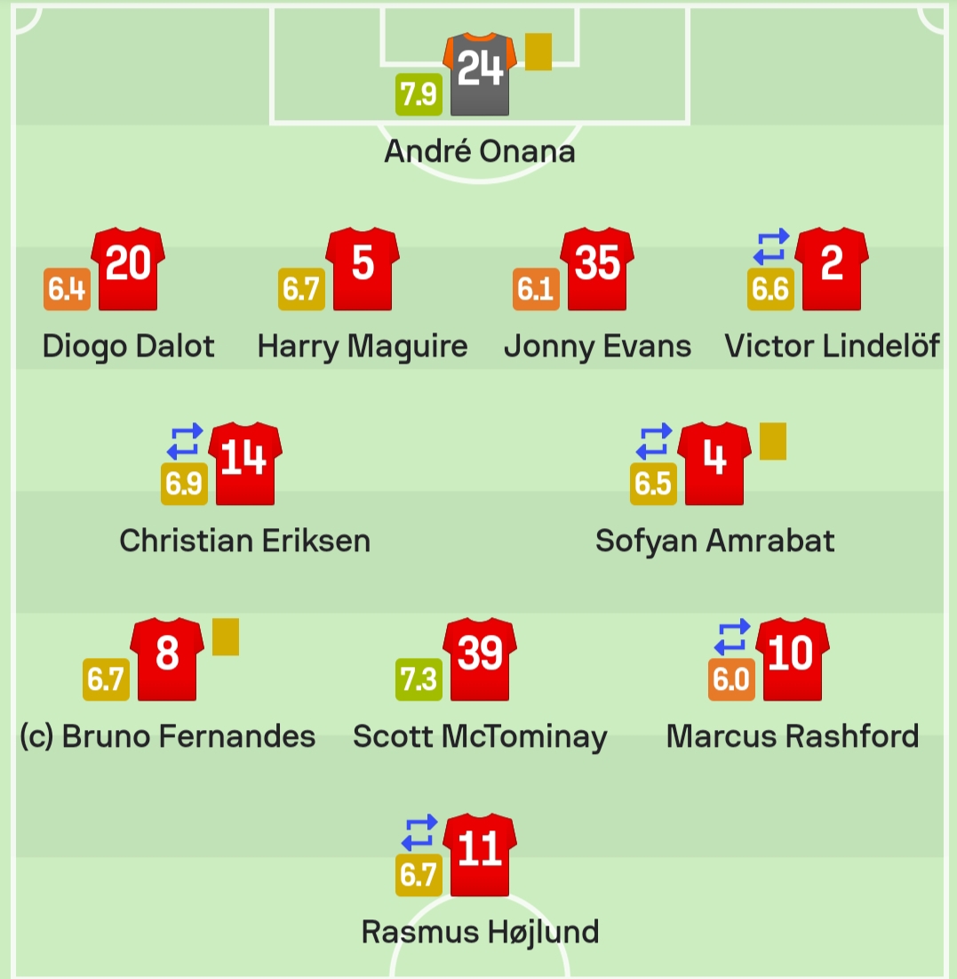 أفضل لاعب في صفوف مانشستر يونايتد أونانا حارس المرمى بتقييم 7.9، يليه اللاعب ماكتموناي بتقييم 7.3.