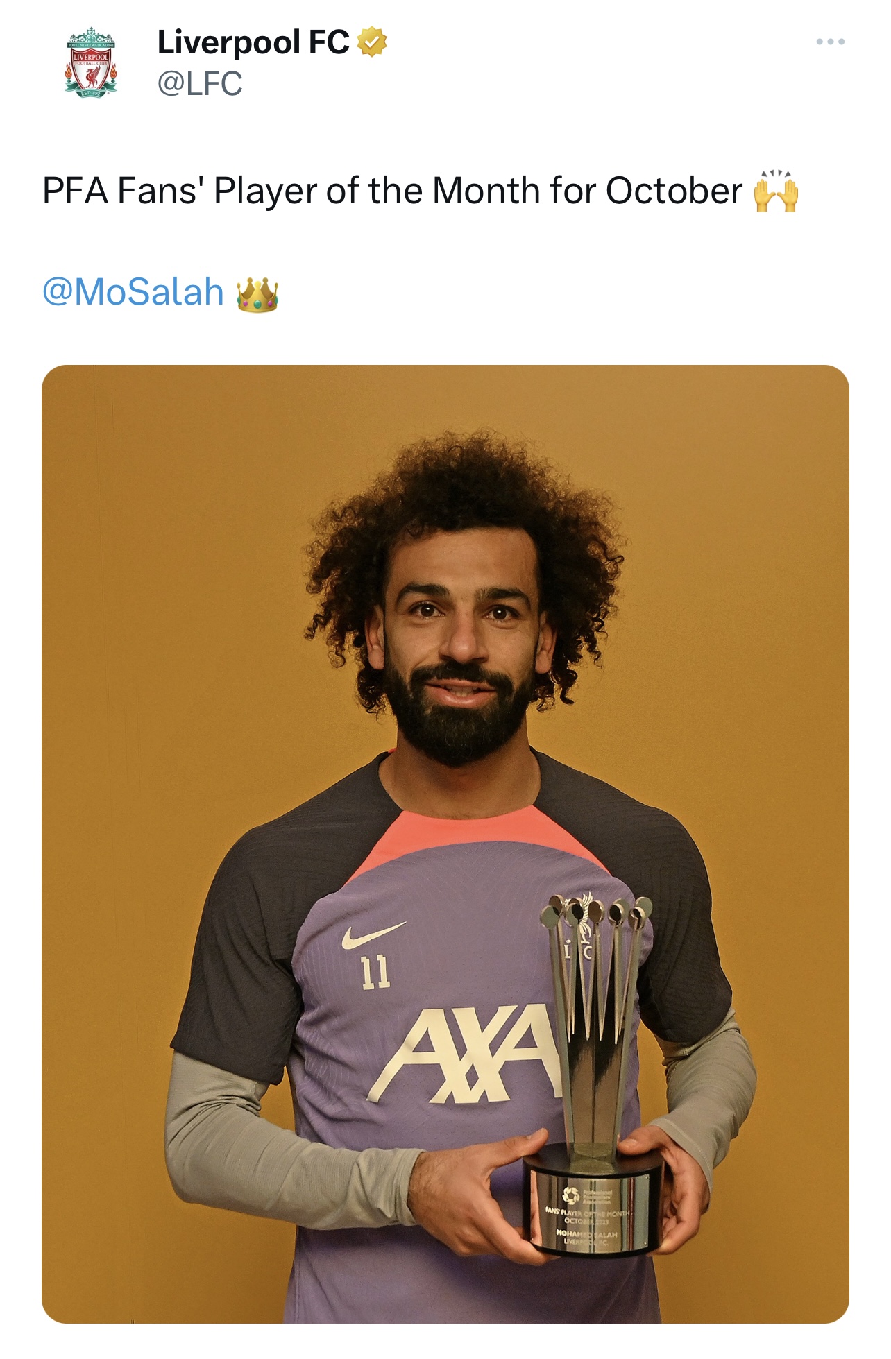 أعلن نادي ليفربول فوز المصري محمد صلاح، نجم الفريق وقائد منتخب مصر، بجائزة لاعب شهر أكتوبر 2023، «من رابطة اللاعبين المحترفين بتصويت الجمهور»، في الدوري الإنجليزي.