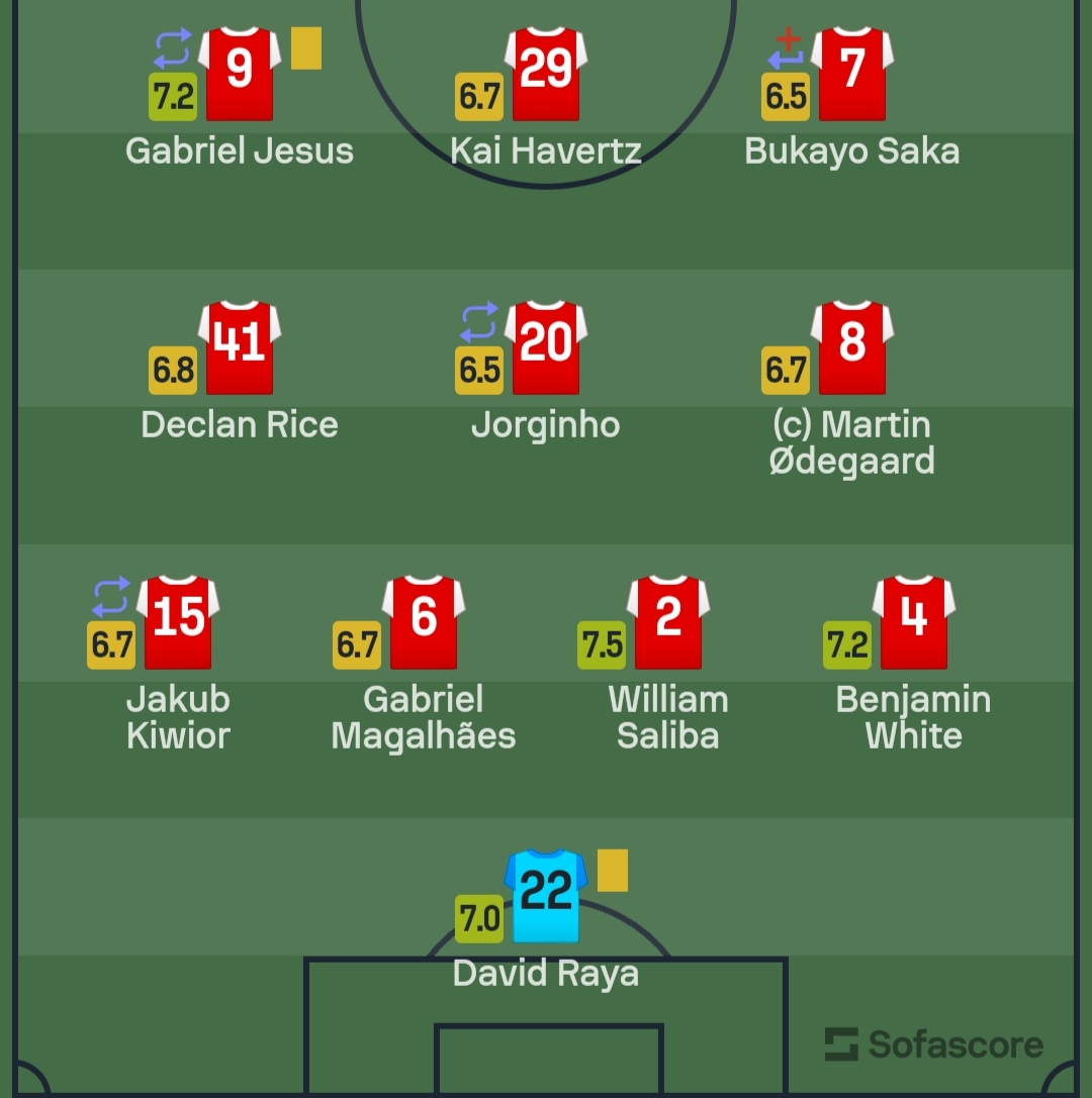 وطبقًا لـ سوفا، فإن ويليام ساليبا، كان أفضل لاعبي آرسنال أمام مانشستر سيتي، بتقييم 7.5، يليه الثنائي بن وايت وجابرييل جيسوس، بـ7.2.