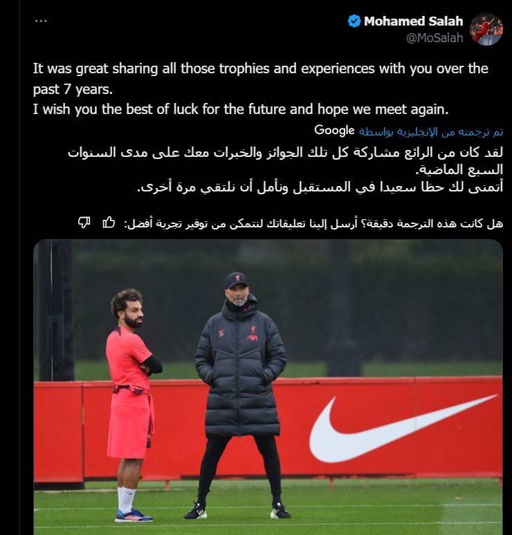 ونشر محمد صلاح، صوره له مع يورجن كلوب، عبر حسابه الرسمي على منصة “إكس”، وعلق قائلًا: “لقد كان من الرائع مشاركة كل تلك الجوائز والخبرات معك على مدى السنوات السبع الماضية”.