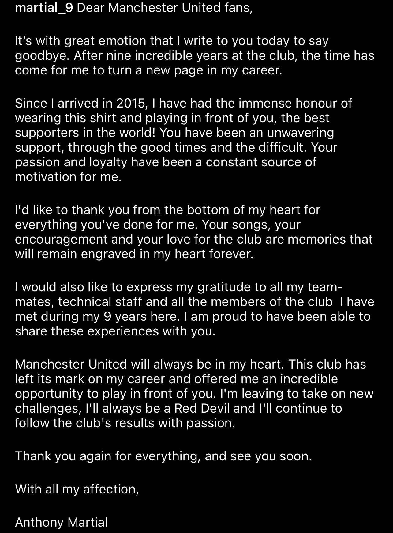 وجه الدولي الفرنسي أنتوني مارسيال، مهاجم نادي مانشستر يونايتد الإنجليزي، رسالة وداع للجماهير، يعلن رحيله عن الفريق بعد 9 سنوات.