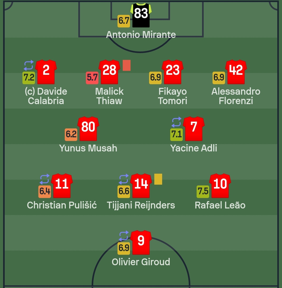 وبحسب شبكة سوفا سكور، فإن رفائيل لياو، كان أفضل لاعب في صفوف ميلان خلال مباراة يوفنتوس بتقييم 7.5، يليه كالابريا بـ7.2، ثم ياسين عدلي 7.1.