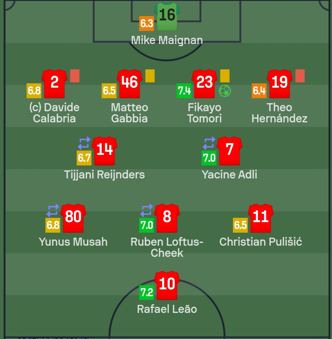 وأوضحت سوفا سكور، أن فيكايو توموري، كان أفضل لاعبي ميلان أمام الإنتر بتقييم 7.4، يليه رفائيل لياو بـ7.2.