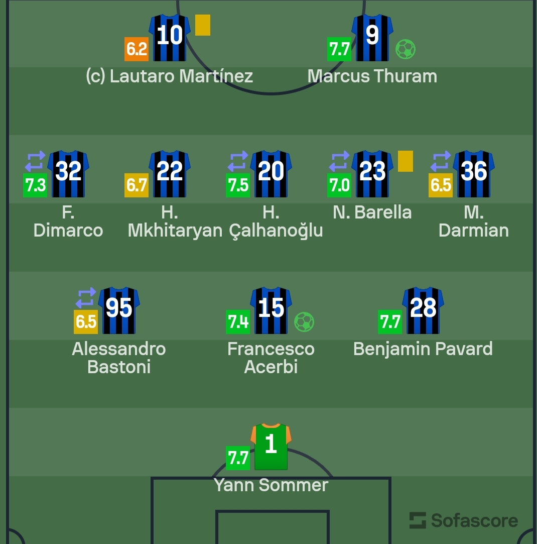 وبحسب سوفا سكور، فإن الثلاثي ماركوس تورام، الحارس سومر، وبنجامين بافارد، كان الأفضل في الإنتر خلال اللقاء بتقييم 7.7، يليهم تشالهان أوغلو بـ7.5 درجة.