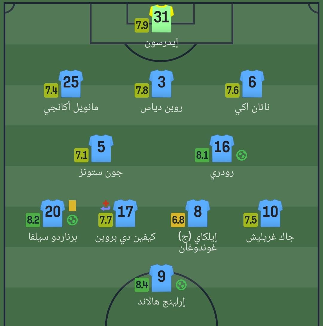 وحصل لاعبو فريق مانشستر سيتي، على تقييمات مميزة، حيث أن إيرلينج هالاند، هو أعلى تقييم 8,4، وفقًا لموقع سوفا سكور المختص في أرقام اللاعبين، فيما حصل ايلكاي على أقل تقييم 6,8.