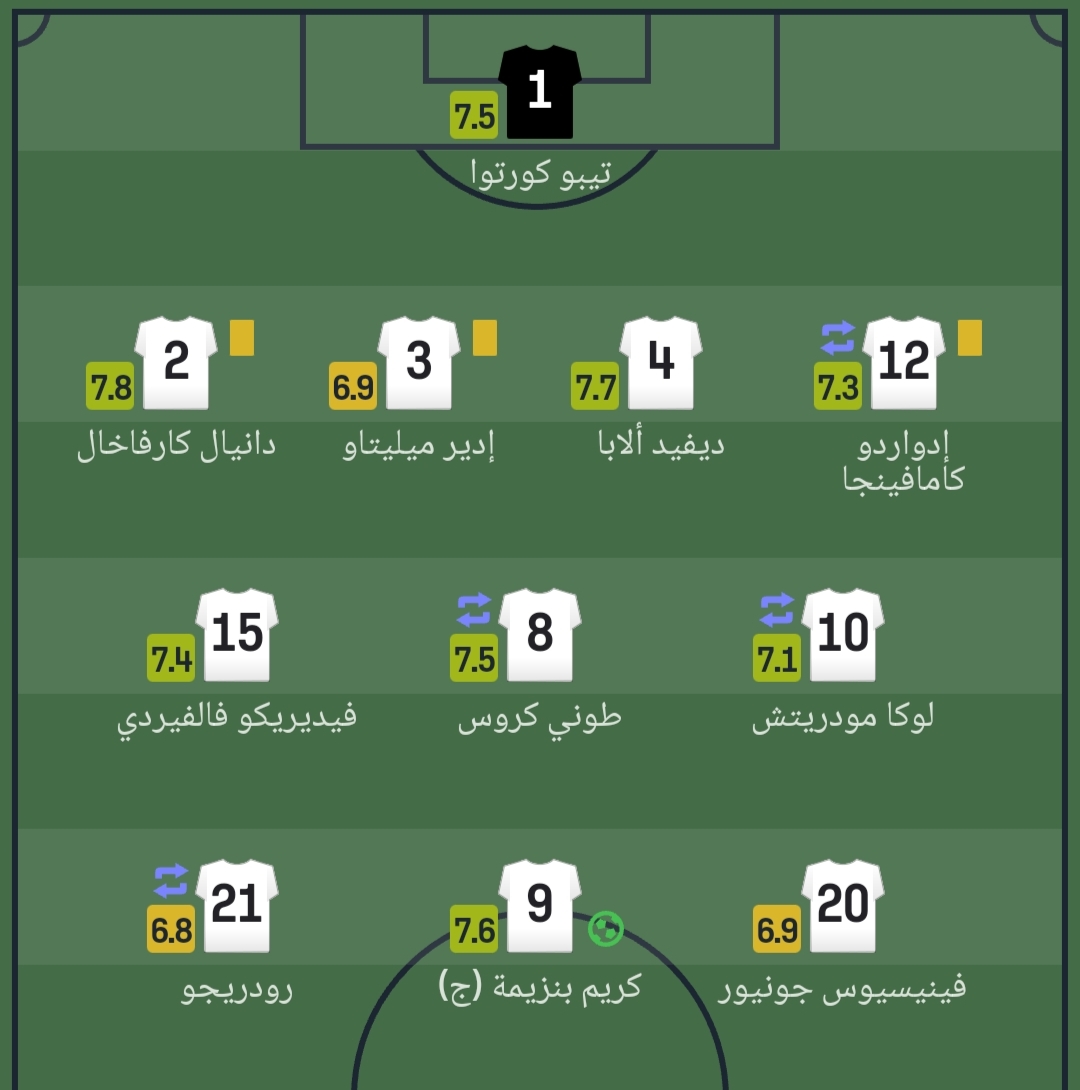 ويأتي ديفيد ألابا، كثاني أفضل لاعب في ريال مدريد بتقييم 7.7، يليه كريم بنزيما بـ7.6 والذي أحرز الهدف الأول في اللقاء.