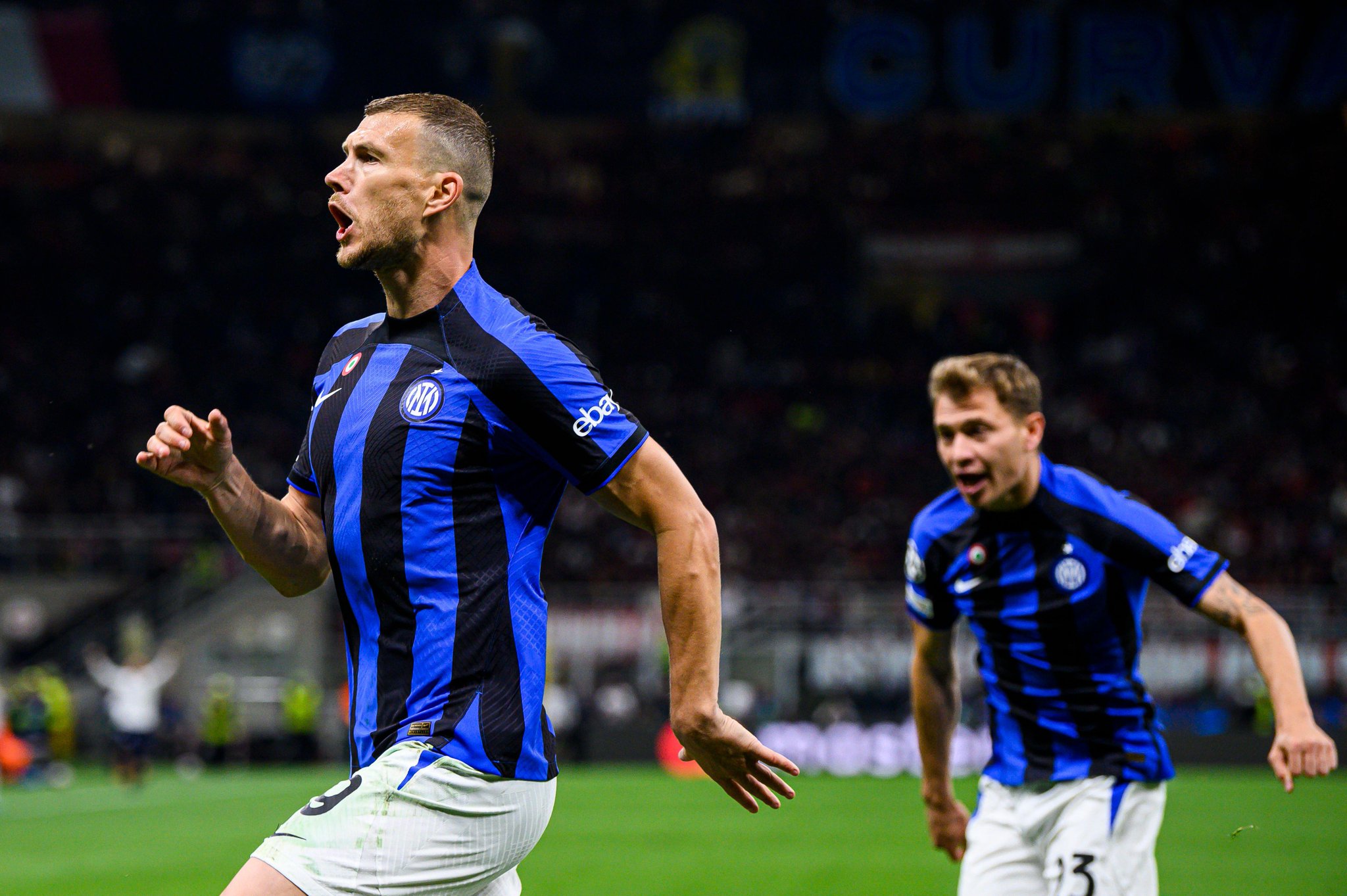 إدين دجيكو بعد تسجيل هدف إنتر الأول أمام إي سي ميلان