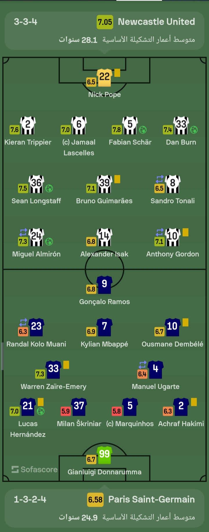 وحصل فابيان شار لاعب فريق نيوكاسل يونايتد الإنجليزي على أفضل تقييم خلال مواجهة باريس سان جيرمان، بدرجة 7,8 وفقًا لموقع سوفا سكور.